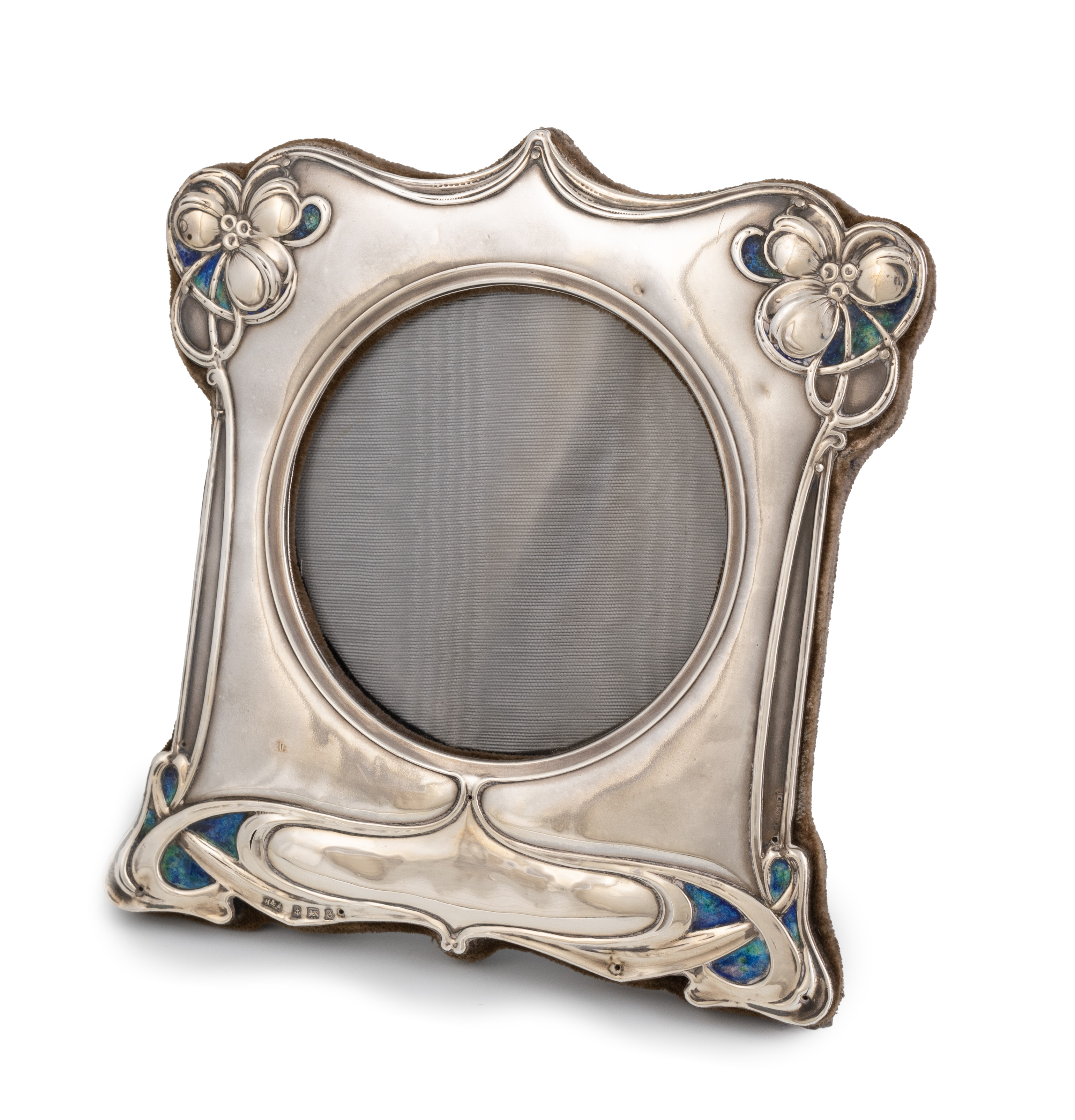 An Edwardian Art Nouveau silver and enamel photograph frame,