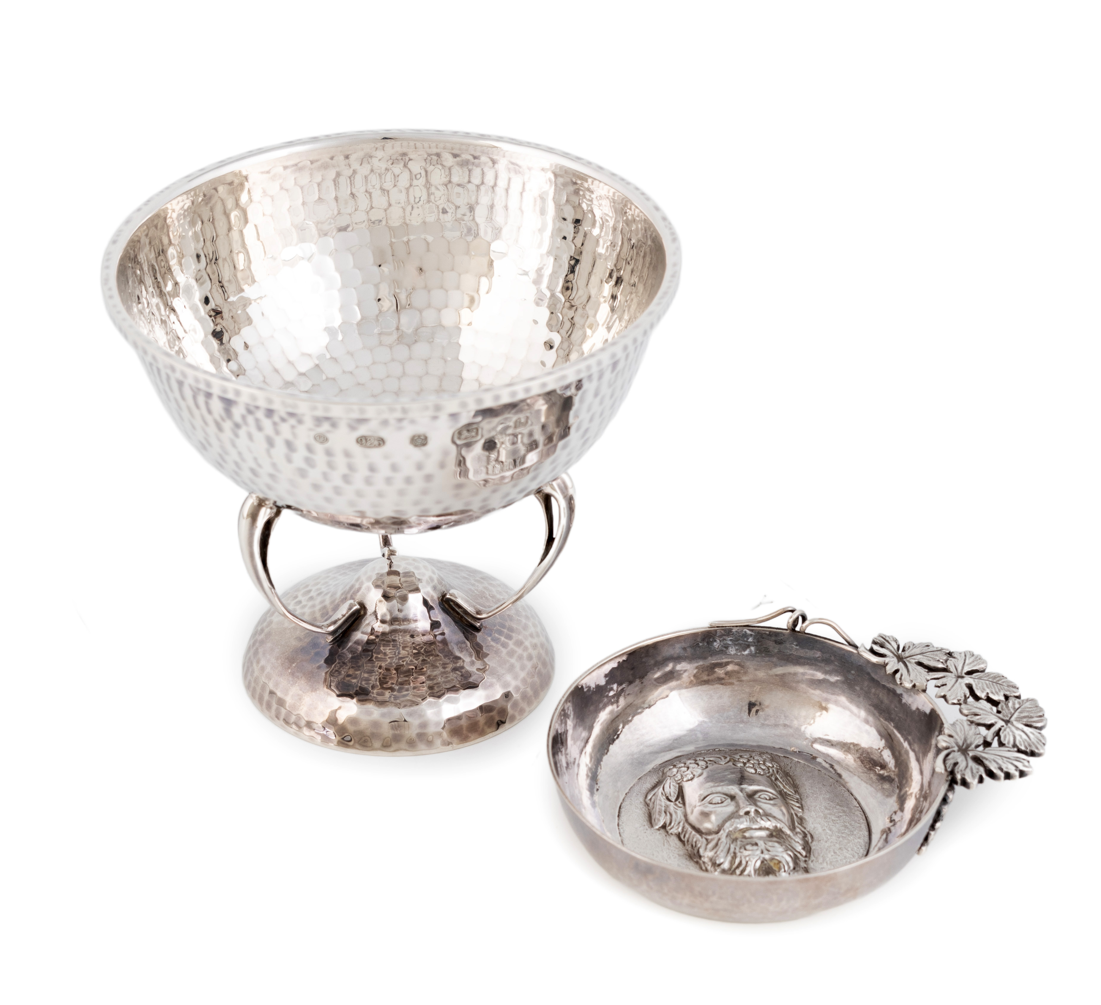 circular form, embossed with the head of Bacchus, pierced vine handle, plus a modern tazza, by Francis Howard, London 2007, circular form, spot-hammered decoration, approx. total weight 10.8oz. (2)