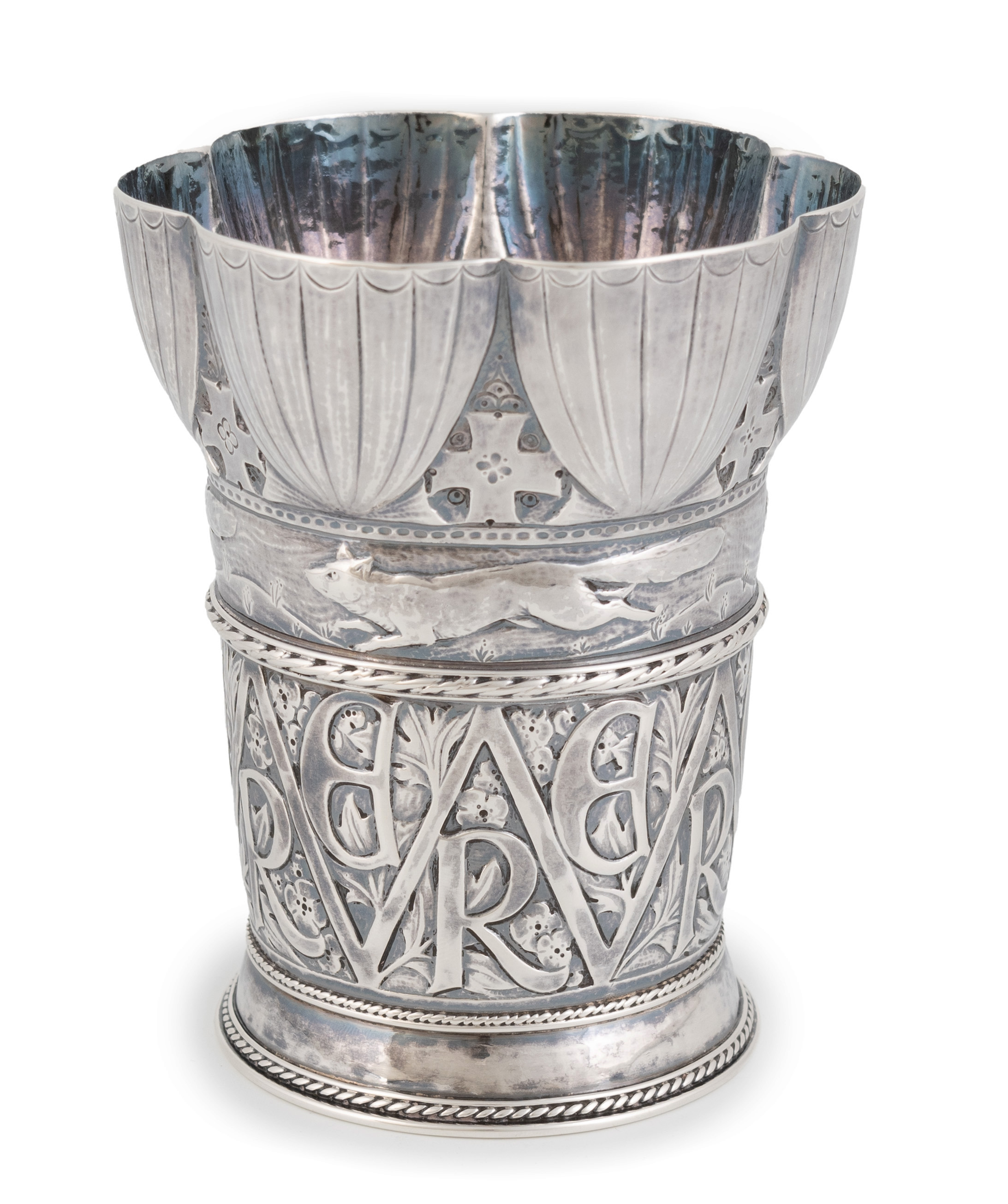 circular form with a scalloped top edge and fluted decoration, ropework borders, a central band of running foxes above repeated E and R motifs with foliate decoration, the underside inscribed 'Edward Reynolds 16.1.1844, Edward Reynolds 6.9.1874, Edward Reynolds 30.7.1915.', height 10.8cm, approx. weight 5.9oz.