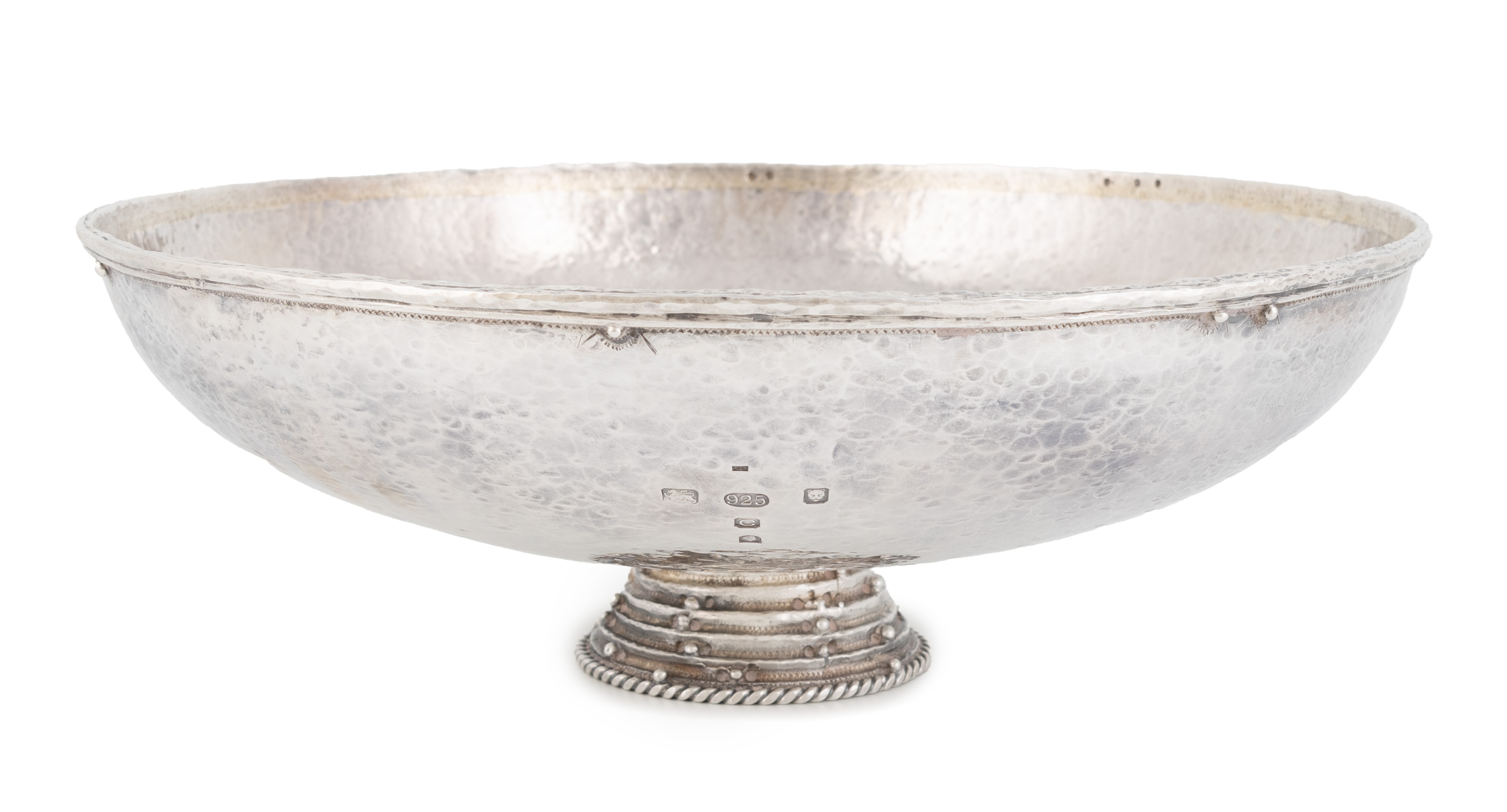 circular form with a spot-hammered finish, central gold bead to the bowl and one to the exterior side, on a stepped beaded circular foot, diameter 27.7cm, approx. weight 40.7oz.