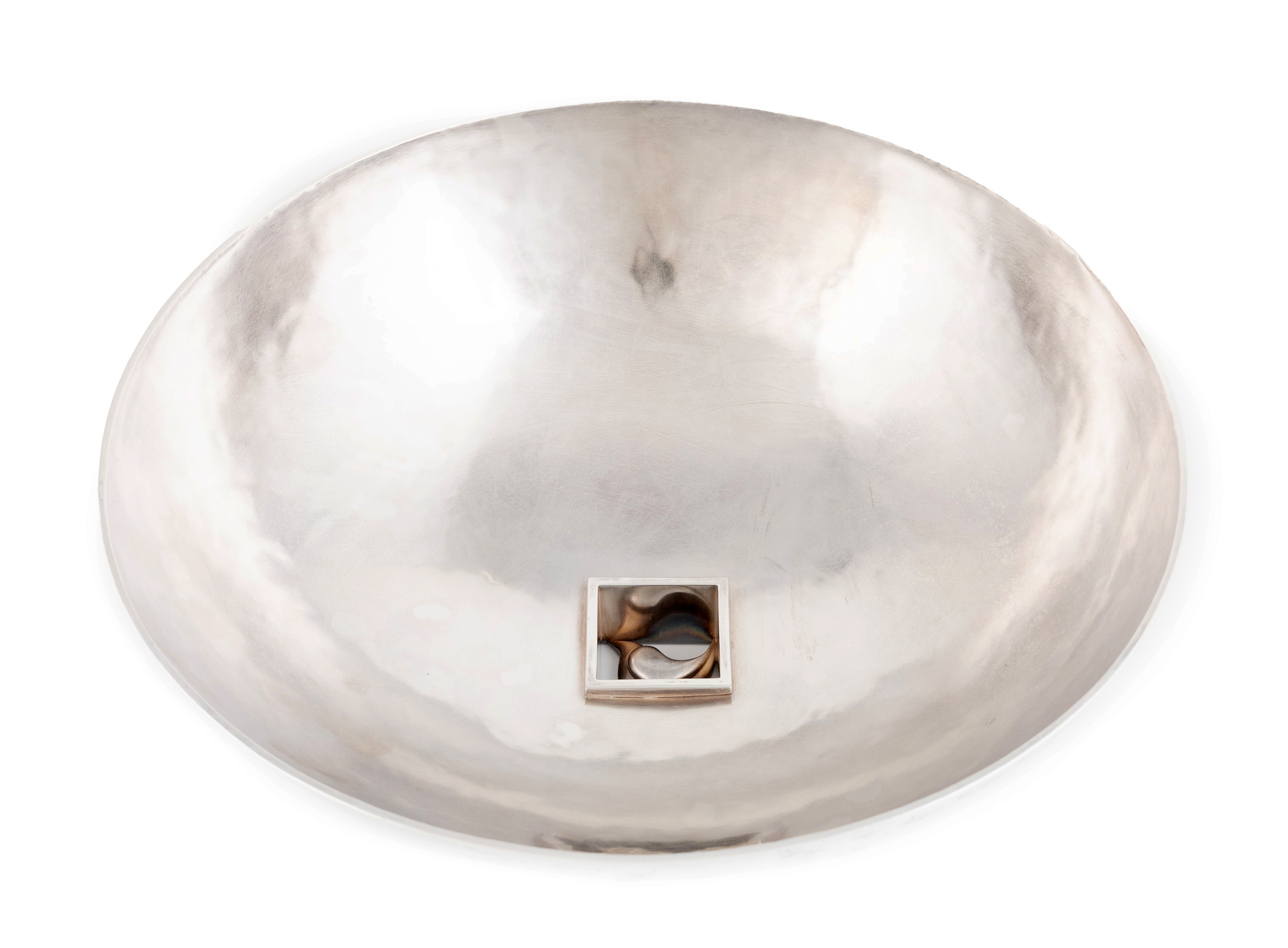 plain circular form, to the centre of the bowl, a pierced square window with a bird silhouette to the centre, diameter 27.3cm, approx. weight 43.3oz.