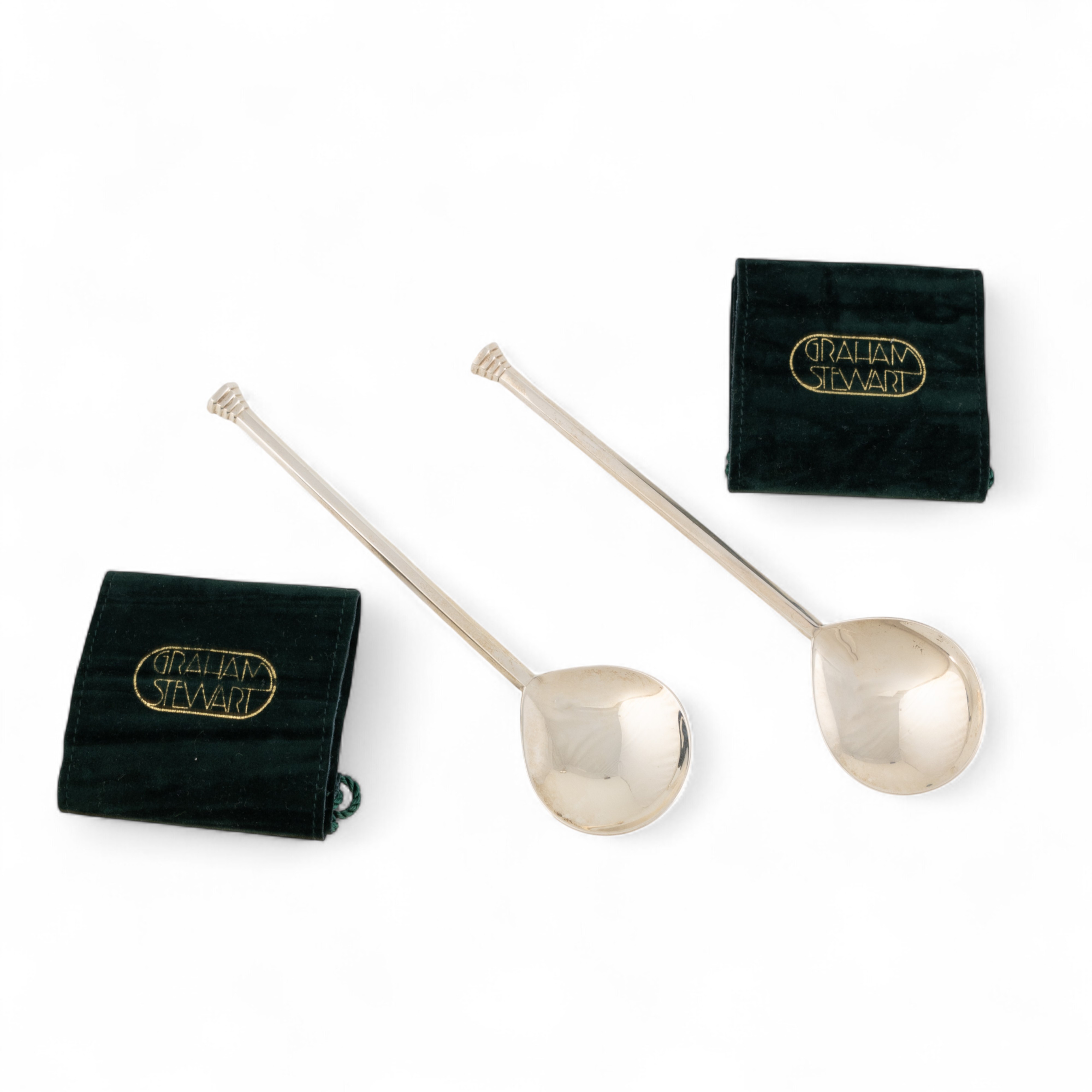 fig-shaped bowls, faceted stems with hexagonal stepped finials, with green felt bags, length 16.9cm, total approx. weight 3.2oz. (2)