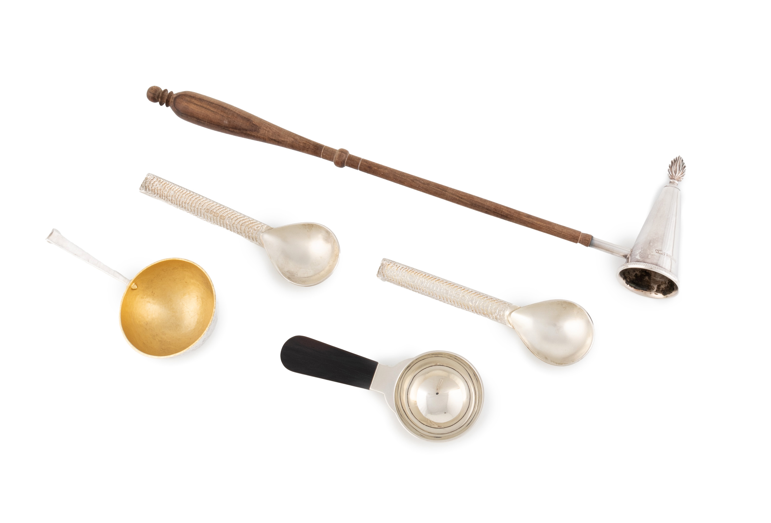 comprising: a coffee measure by Jeffrey A Sofaer, London 2001, with a wooden handle, another coffee measure by Stuart Jenkins, London 2014, with a spot-hammered finish, a pair of spoons by Don Porritt, Sheffield 2009, with textured tree bark handles, plus a silver candle snuffer maker's mark NWJ, Birmingham 1994, total approx. weighable 4.4oz. (5)