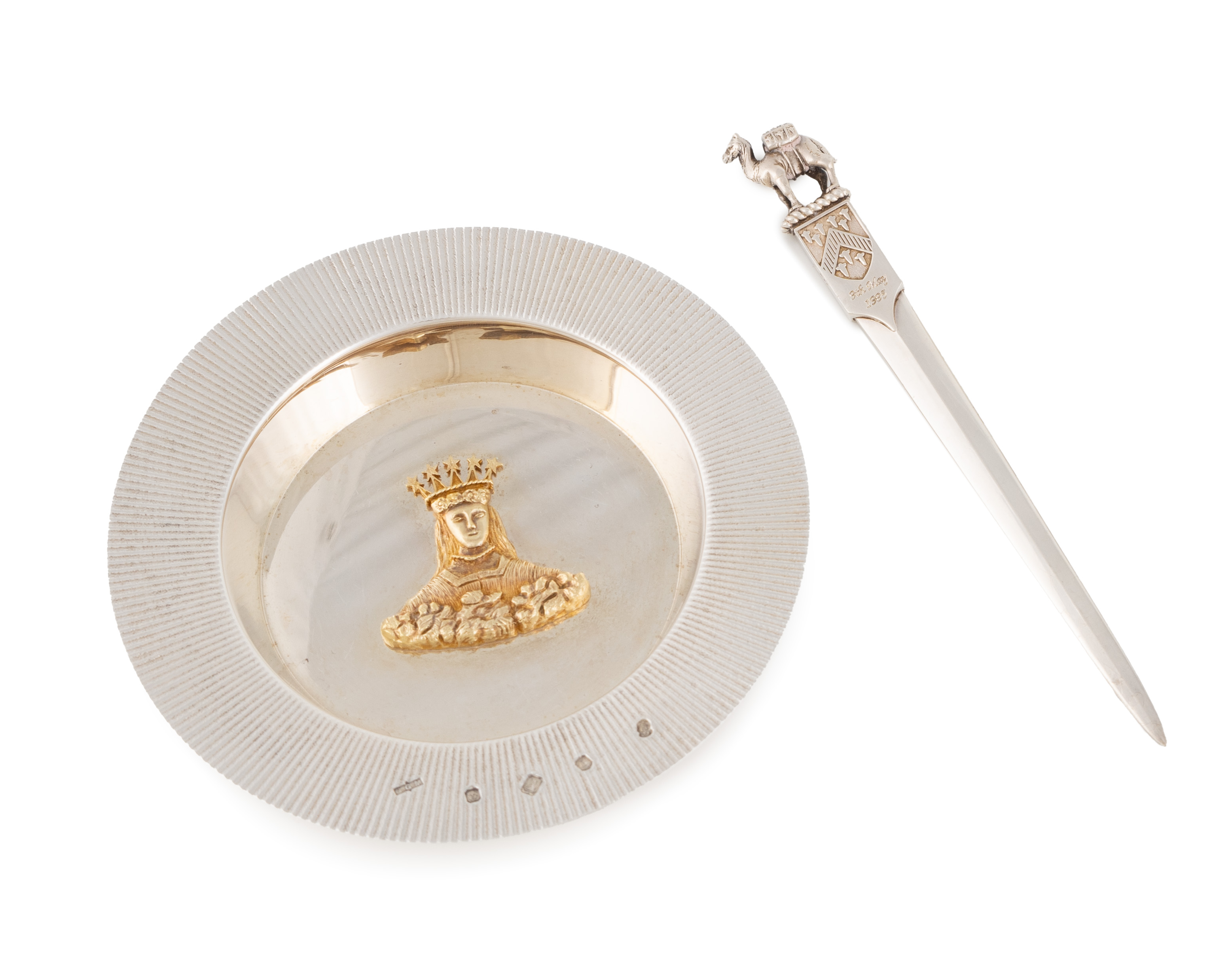 circular form, textured border, the centre with the raised silver-gilt Company's maiden, the underside inscribed 'The Gift of The Mercer's Company Queen Elizabeth II Silver Jubilee 1977', diameter 12.6cm, plus a silver Grocer's Company paper knife by Richard Fox, London 1995, total approx. weight 5.8oz. (2)