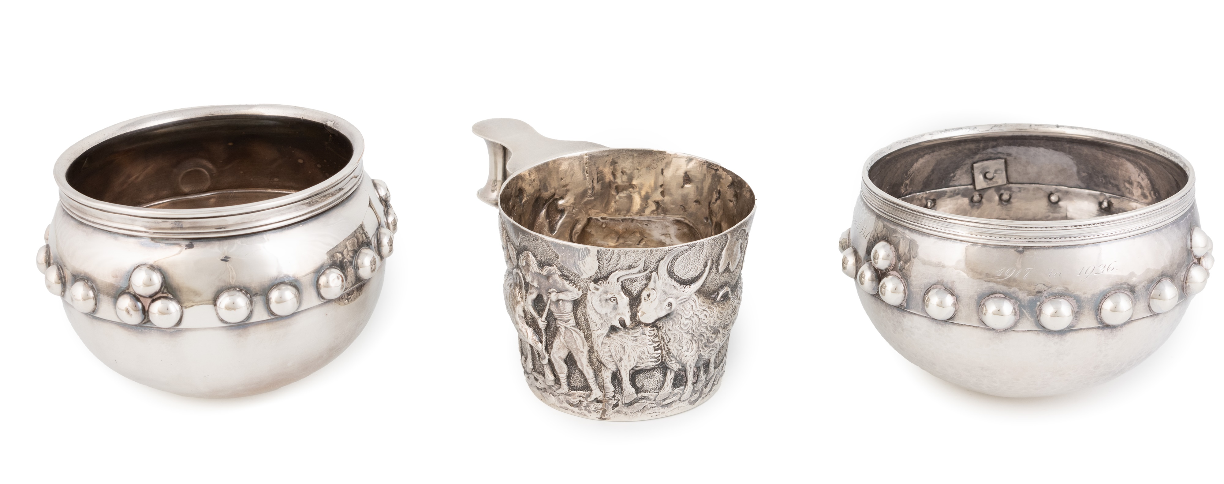circular form with a spot-hammered finish, applied beads to the body, engraved presentation inscription, diameter 11.2 cm, plus an electroplated 'Glastonbury' bowl, and a silver copy of the Vaphio cup by Nathan & Hayes, Birmingham 1900, total approx. weighable 17.2oz. (3)