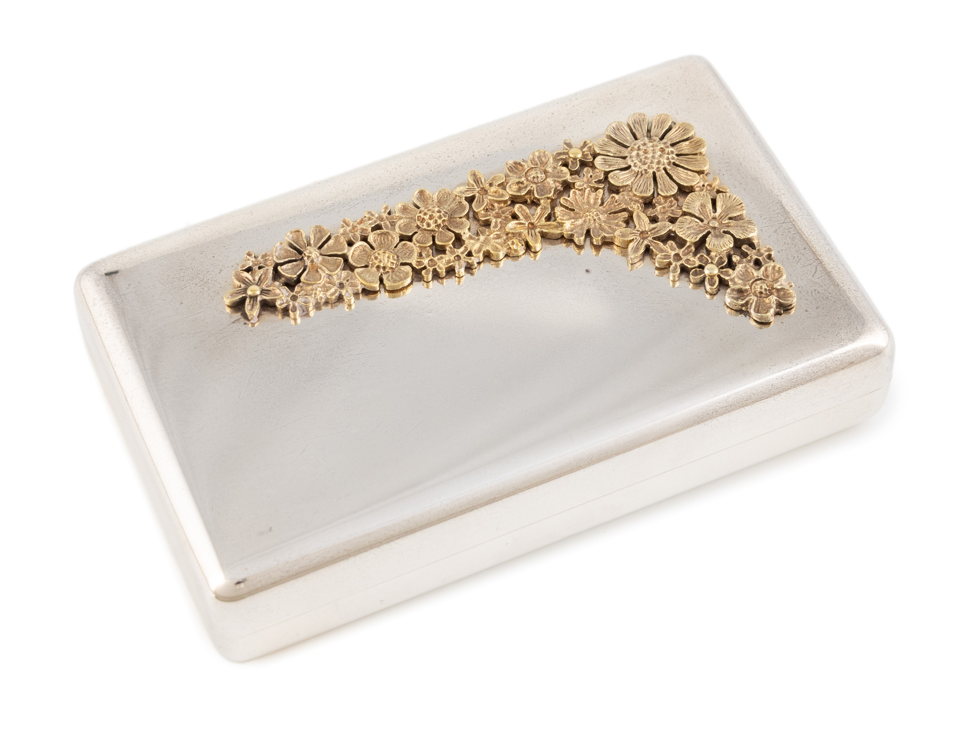 rounded rectangular form, the hinged cover applied with a silver-gilt floral spray, length 9.6cm, approx. weight 5.2oz.