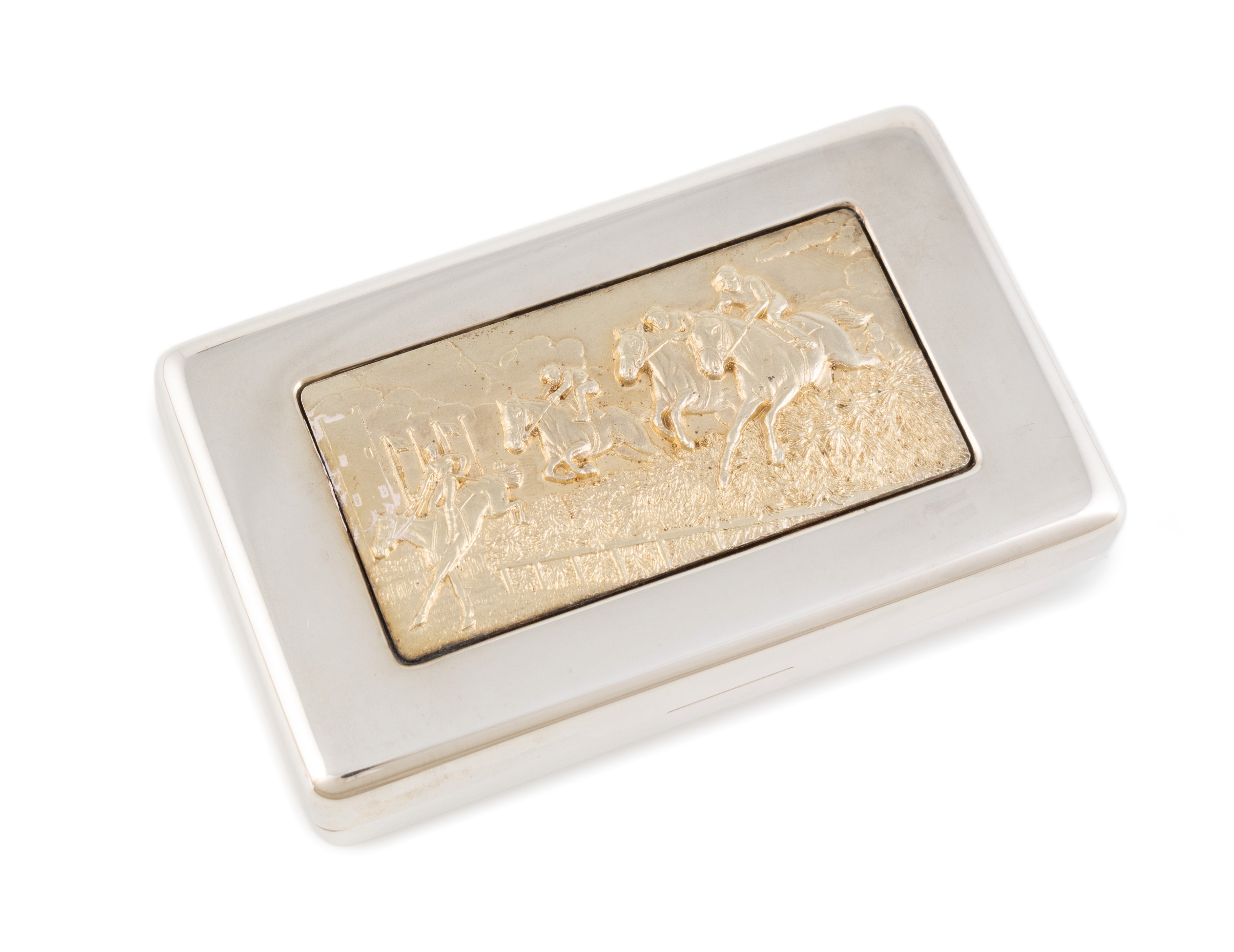 rounded rectangular form, the hinged cover with relief panel of a steeple chase, length 9.7cm, approx. weight 4.8oz.