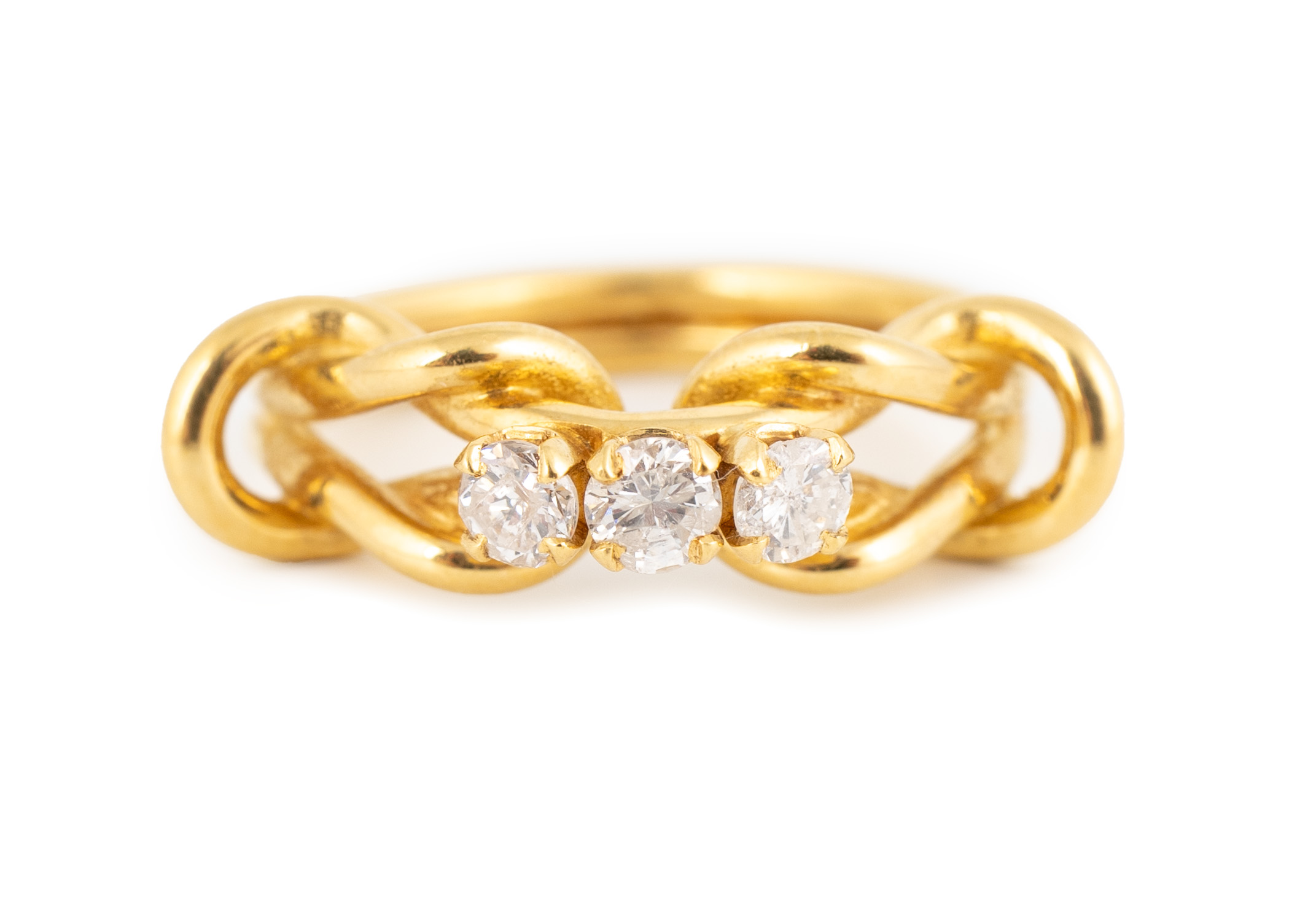 By Stuart Devlin, a modern 18-carat gold and three-stone diamond reef knot ring,