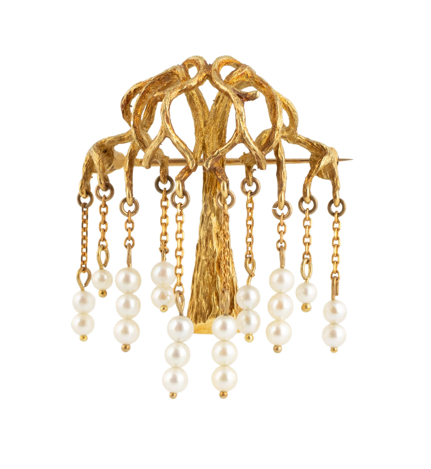 By Stuart Devlin, a modern 18-carat gold and pearl weeping willow brooch,