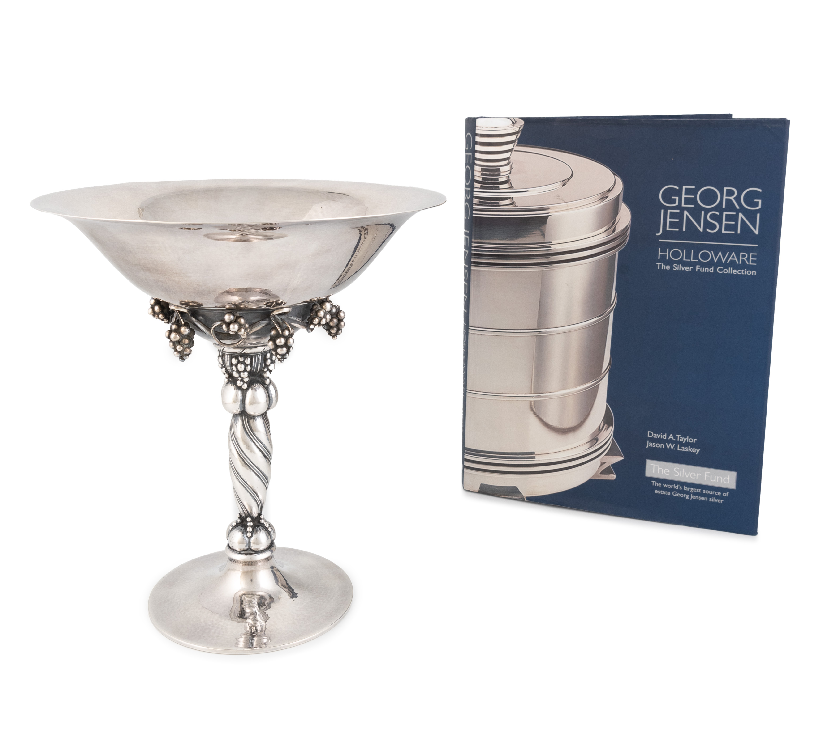 grape pattern, the circular pedestal foot with spiral twist decoration, the circular bowl with hanging bunches of grapes, spot-hammered decoration, height 27.1cm, plus D. A. and Laskey, J. W., Georg Jensen Holloware, approx. weighable 37.8oz. (2)
