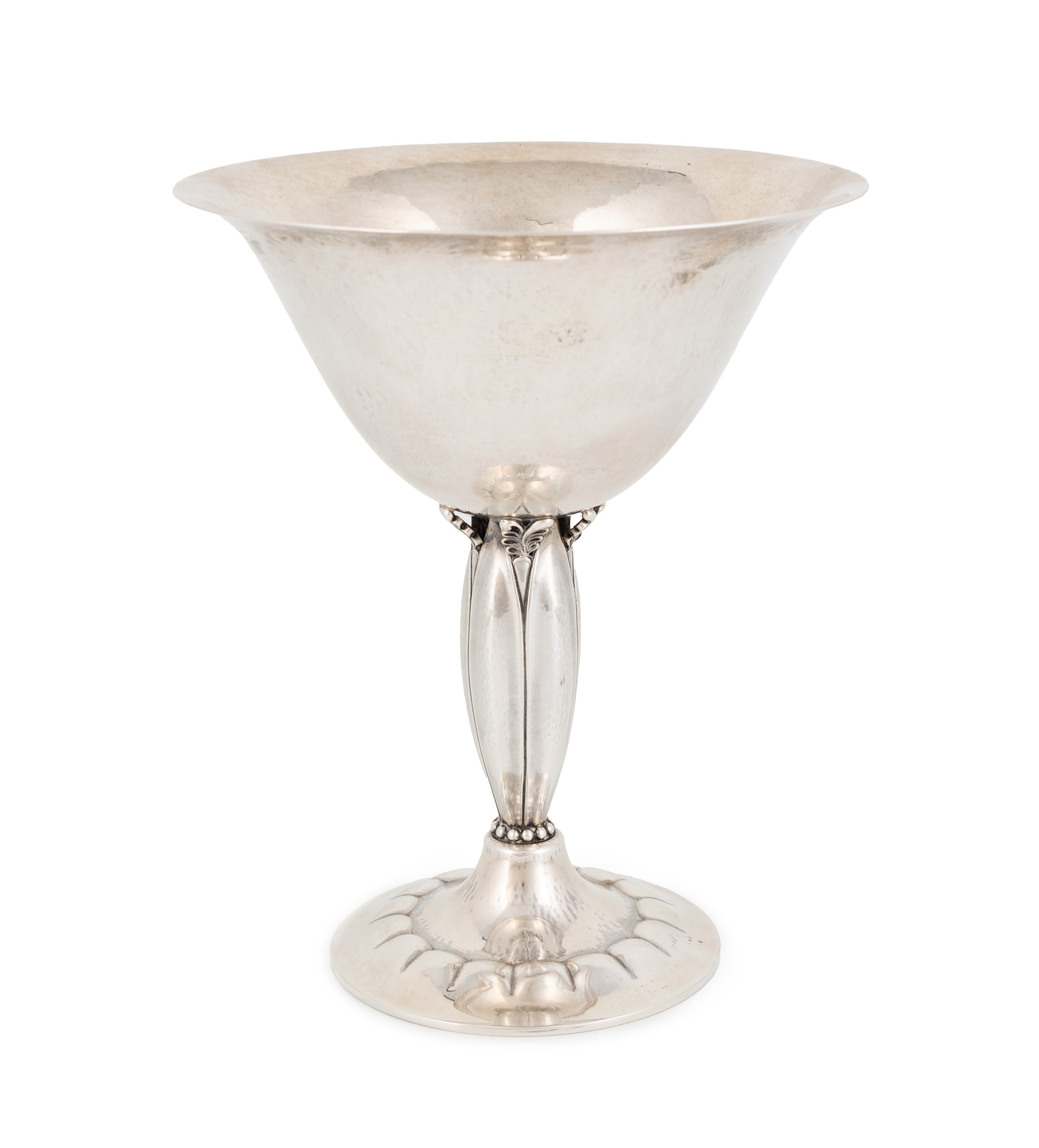 with a spot-hammered circular bowl, the circular pedestal foot with a beaded edge, filigree leaves and a central leaf stem, height 19.3cm, approx. weight 13.4oz.