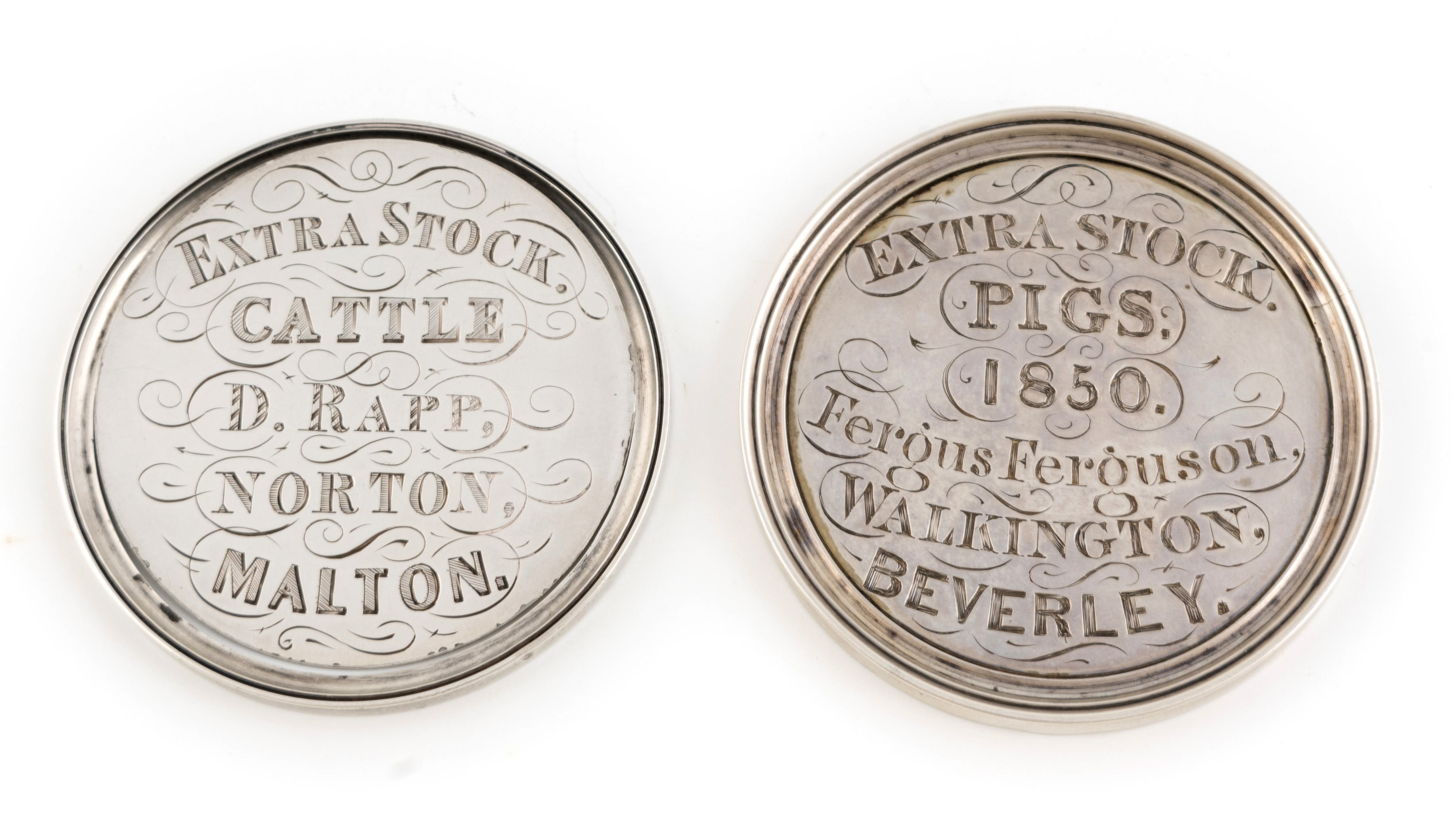 circular form, inscribed 'Yorkshire Agricultural Society, Second Prize', the reverse inscribed 'Extra Stock Pigs 1850, Fergus Ferguson, Walkington, Beverley', diameter 6cm, plus another silver agricultural medal, possibly York 1858, later maker's mark RH, inscribed 'Yorkshire Agricultural Society, Second Prize, 1860', the reverse inscribed 'Extra Stock Cattle, D. Rapp. Norton. Malton', loose in frame, approx. total weight 2oz. (2)