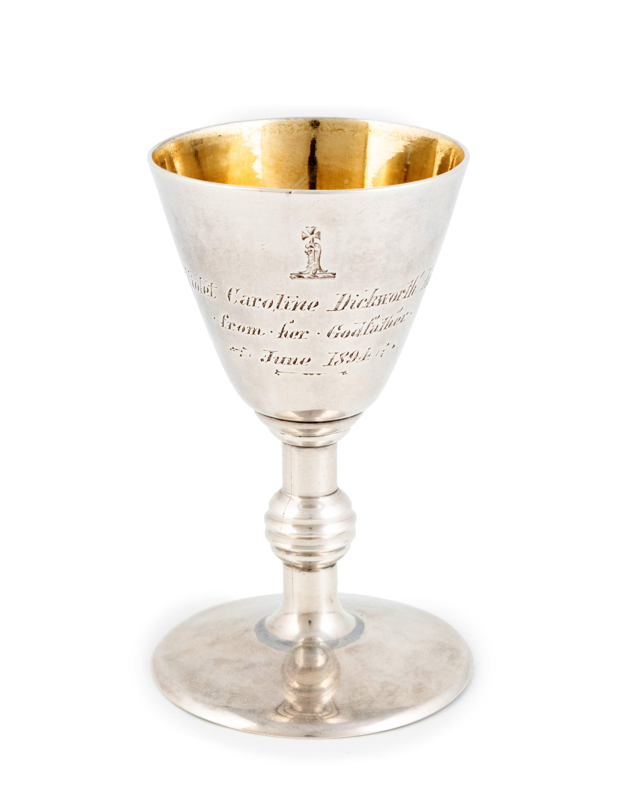 tapering circular bowl, on a knopped stem on a circular foot, engraved with a crest and inscribed 'Violet Caroline Dickworth King, from her Godfather, June 1894', height 9.6cm, approx. weight 3.2oz.