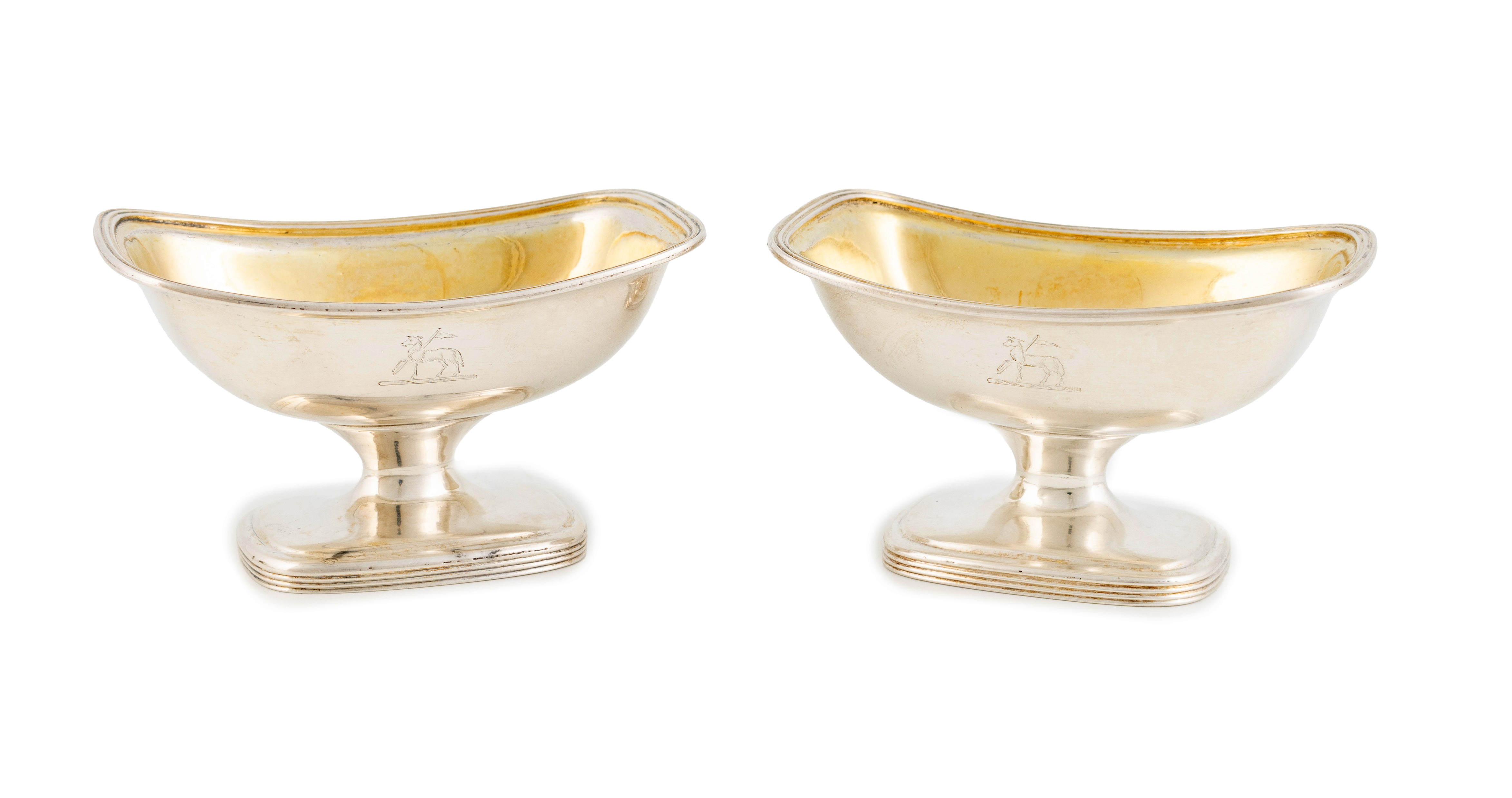 rounded rectangular form, reeded borders, gilded bowls, on raised rounded rectangular bases, engraved with a crest, length 10cm, approx. weight 7.7oz. (2)