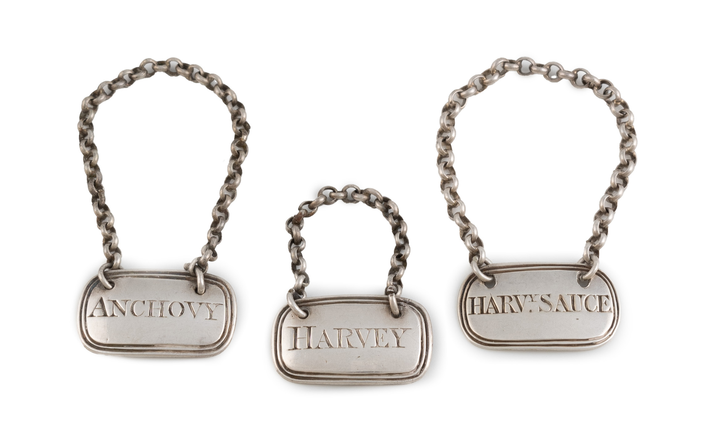 oblong form, reeded borders, incised 'Harvey', 'Anchovy' and 'Harvy Sauce', approx. total weight 0.4oz. (3)