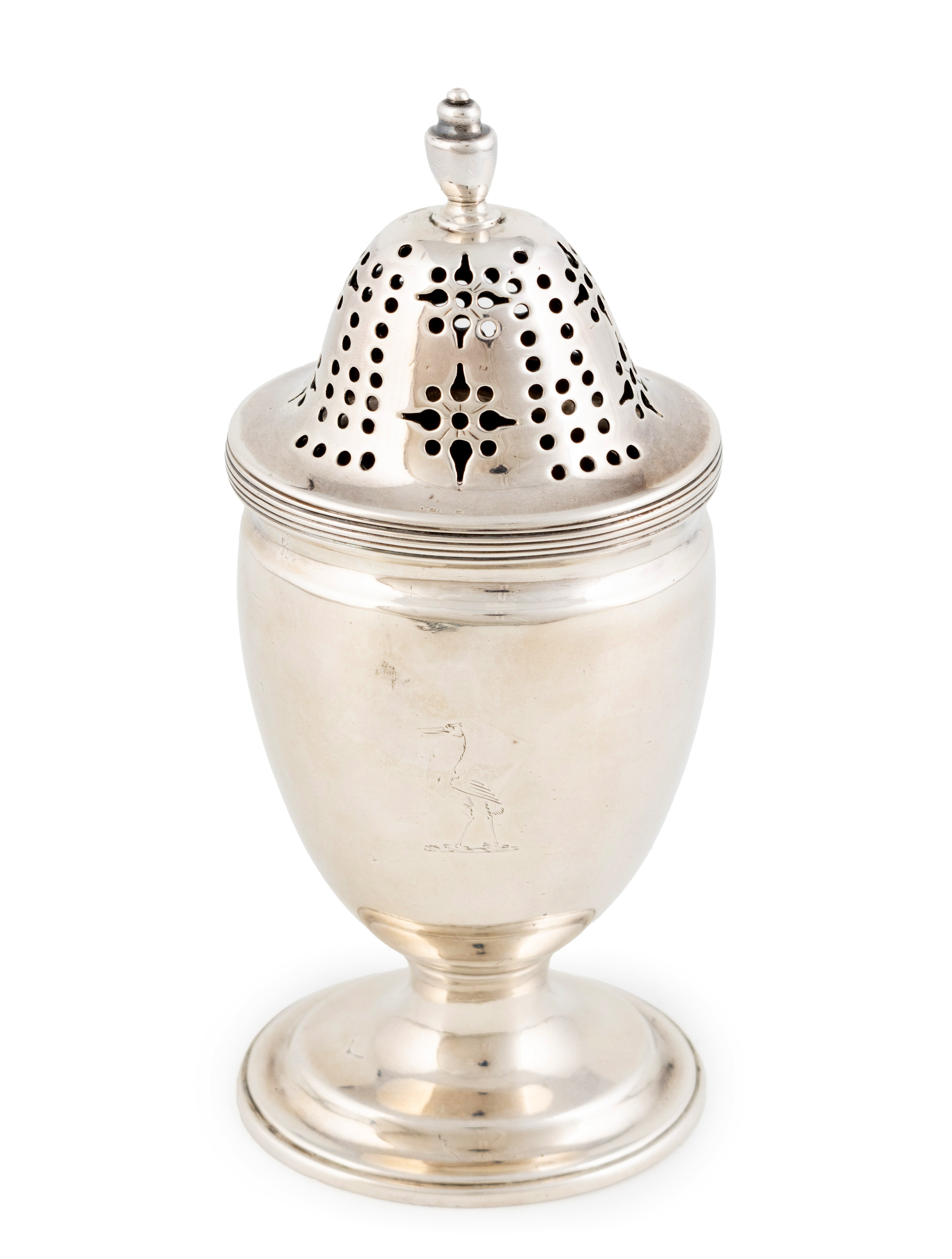 tapering oval form, reeded border, the pull-off pierced cover with an urn finial, on an oval foot, height 17.8cm, approx. weight 9.7oz.
