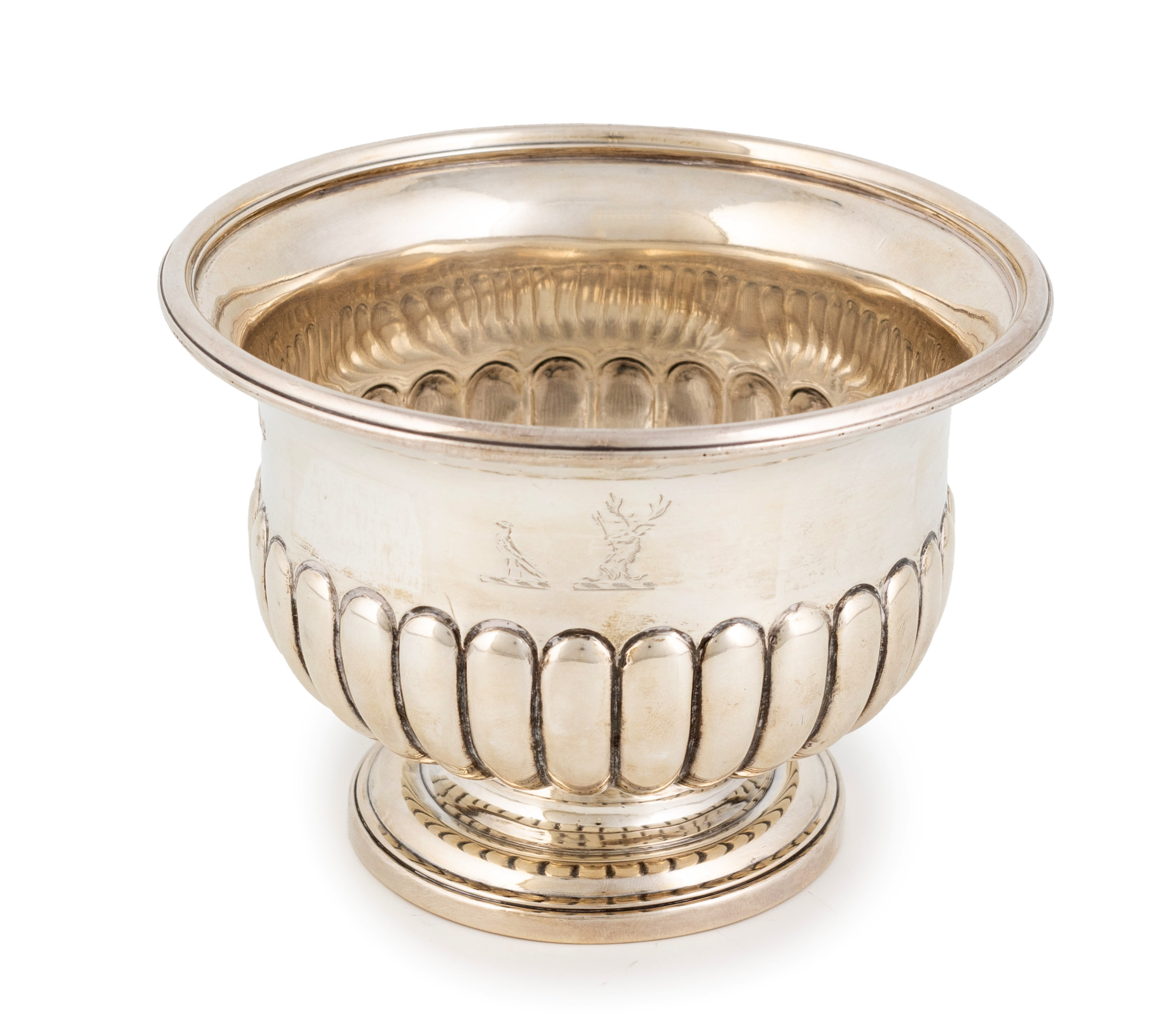 circular form, part-fluted decoration, engraved with two crests, height 8.5cm, approx. weight 10oz.