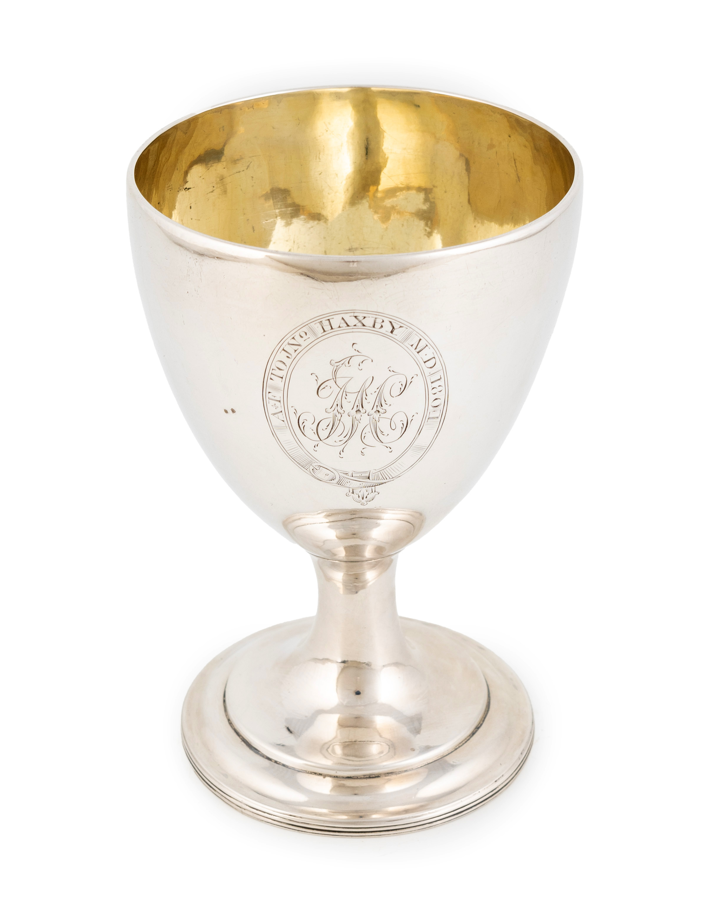plain urn bowl, gilded interior, engraved with initials, and inscribed 'A*F To JNo. Haxby M.D 1801', on a raised circular foot, height 15.2cm, approx. weight 8.1oz.
