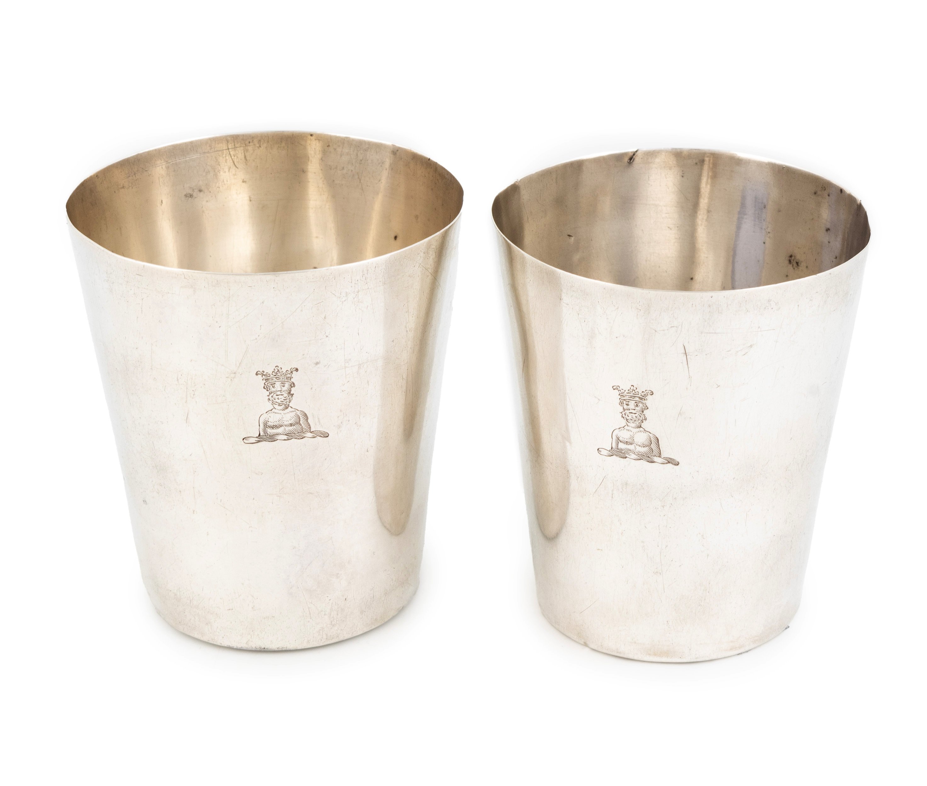 tapering circular form, engraved with a crest, heights 8.2cm and 8.3cm, approx. weight 5.5oz. (2)