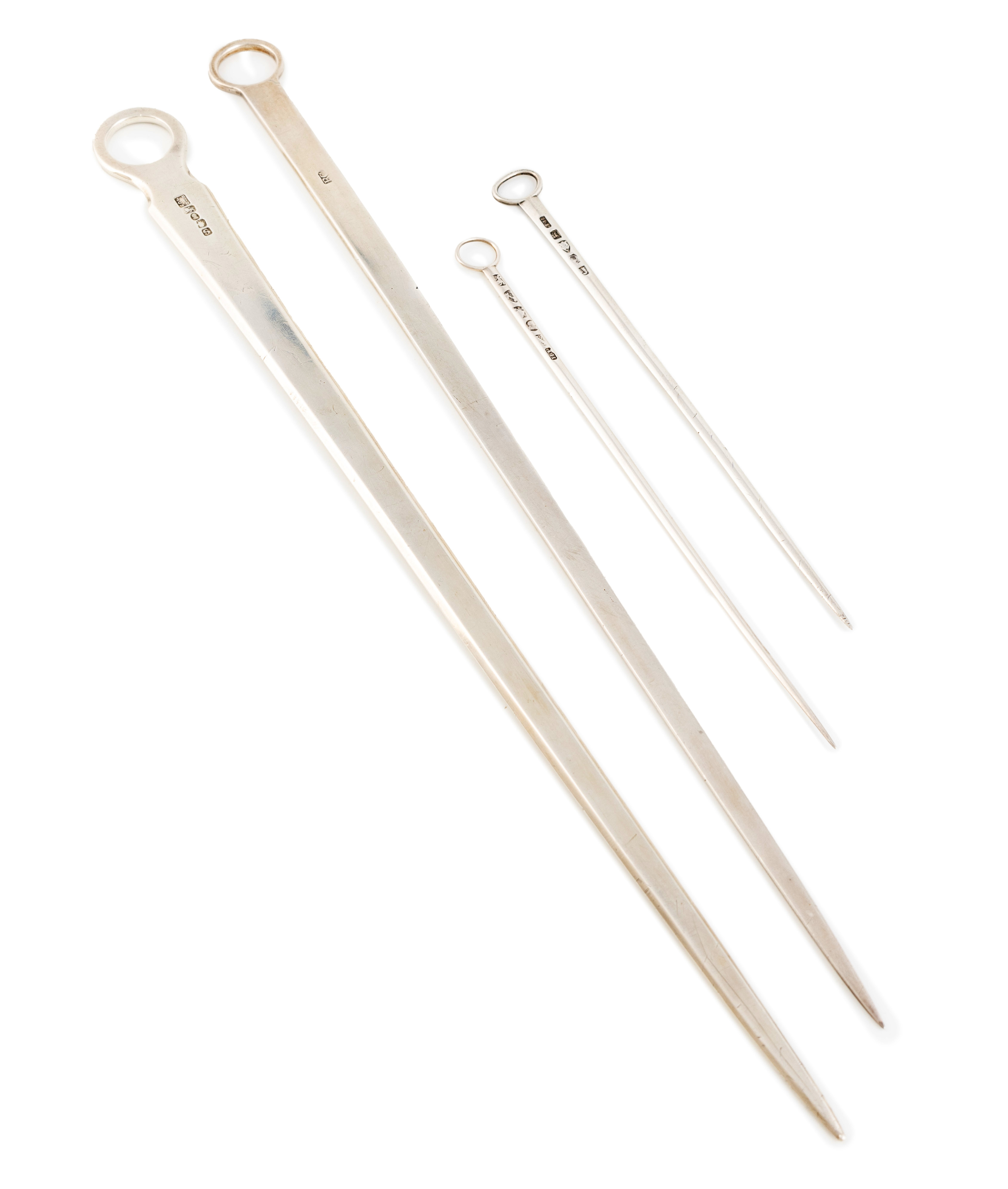 comprising: one by Barber, Cattle and North, York 1829, one with maker's mark only RC for Robert Cattle, plus a poultry skewer, by John Hampston and John Prince, York 1784, and another poultry skewer, by the same maker, with Newcastle marks for 1788, tapering form, plain ring terminals, approx. total weight 6oz. (4)