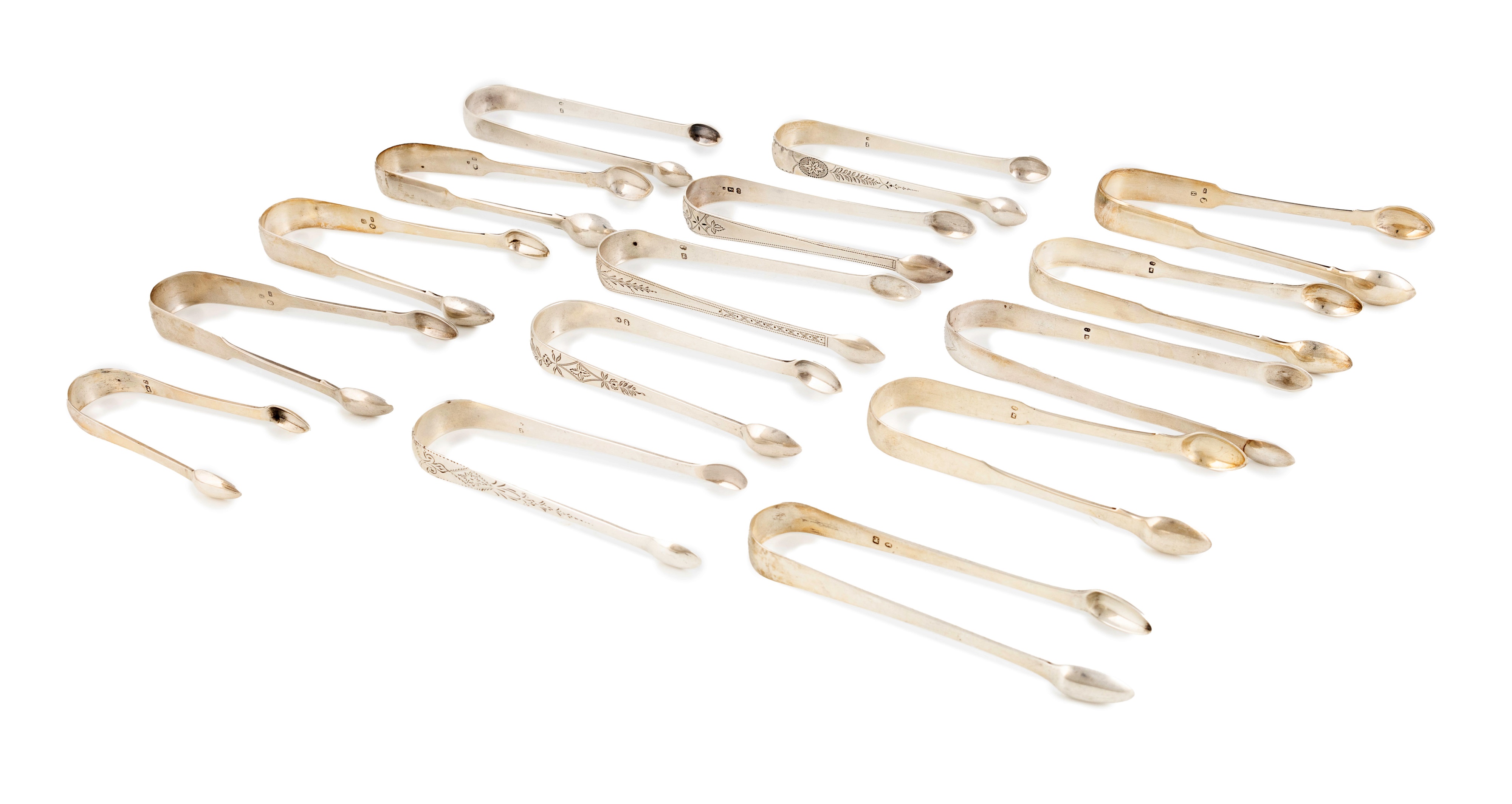 A collection of fifteen pairs of antique provincial silver sugar tongs,