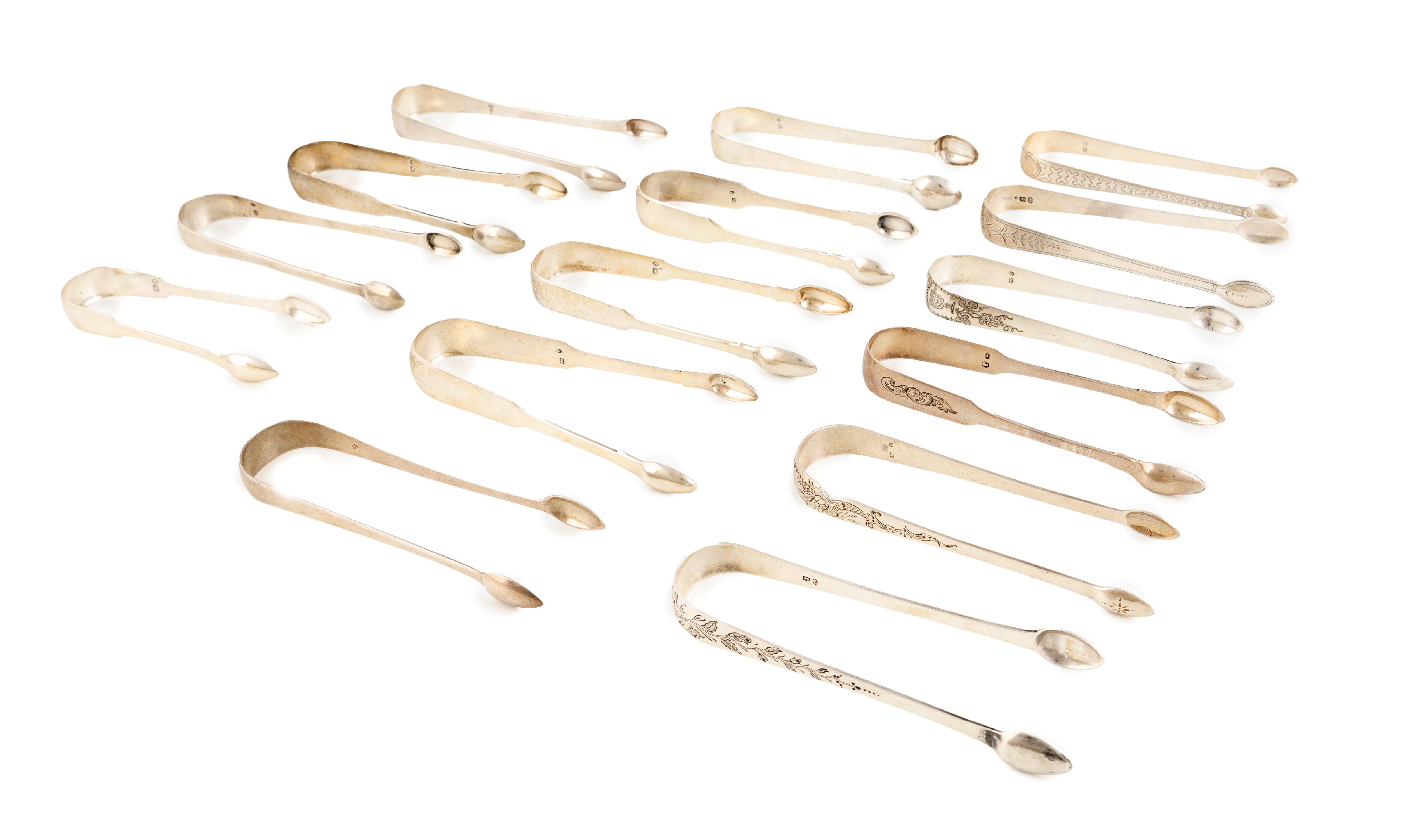 A collection of fifteen pairs of antique provincial silver sugar tongs,