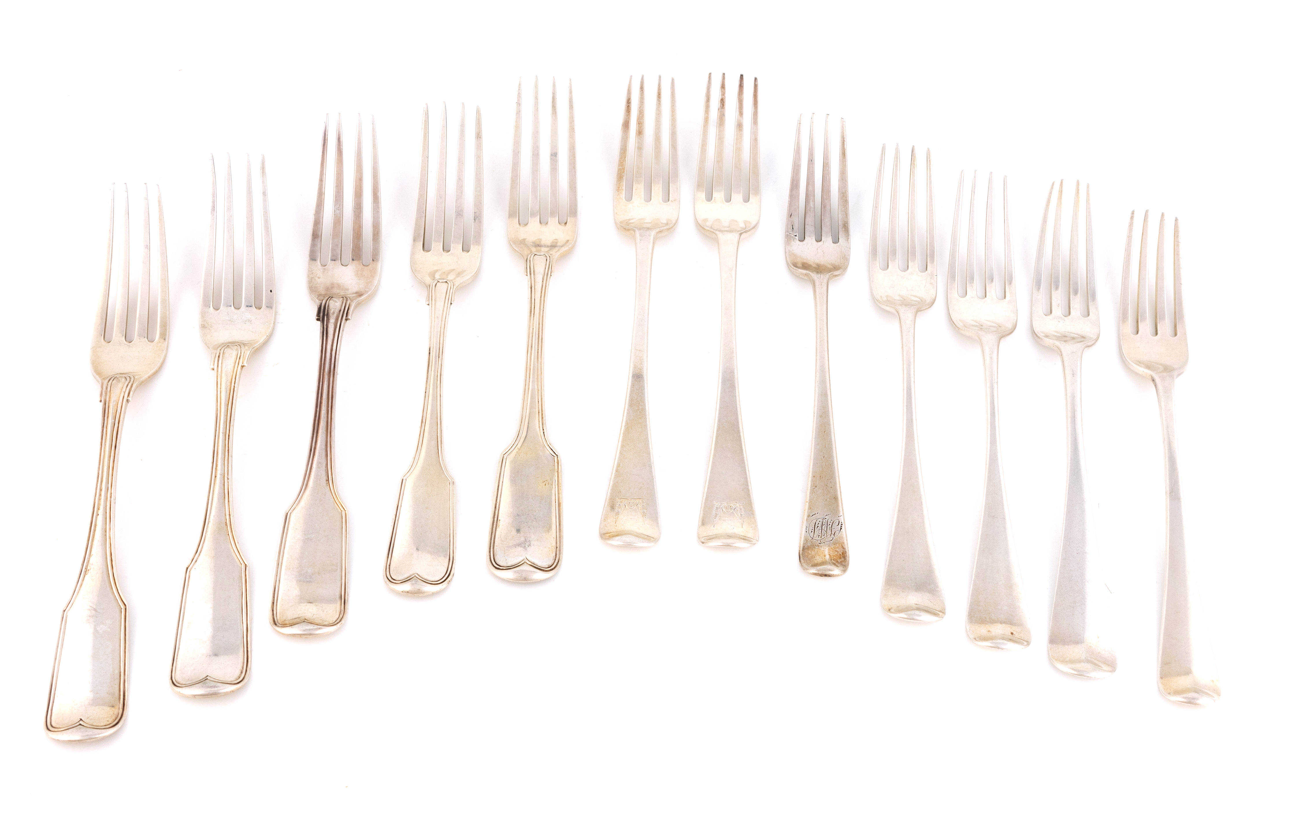 some with crests, including seven Old English ones and five Fiddle and Thread pattern forks, two of which are London made, approx. total weight 27oz. (12)