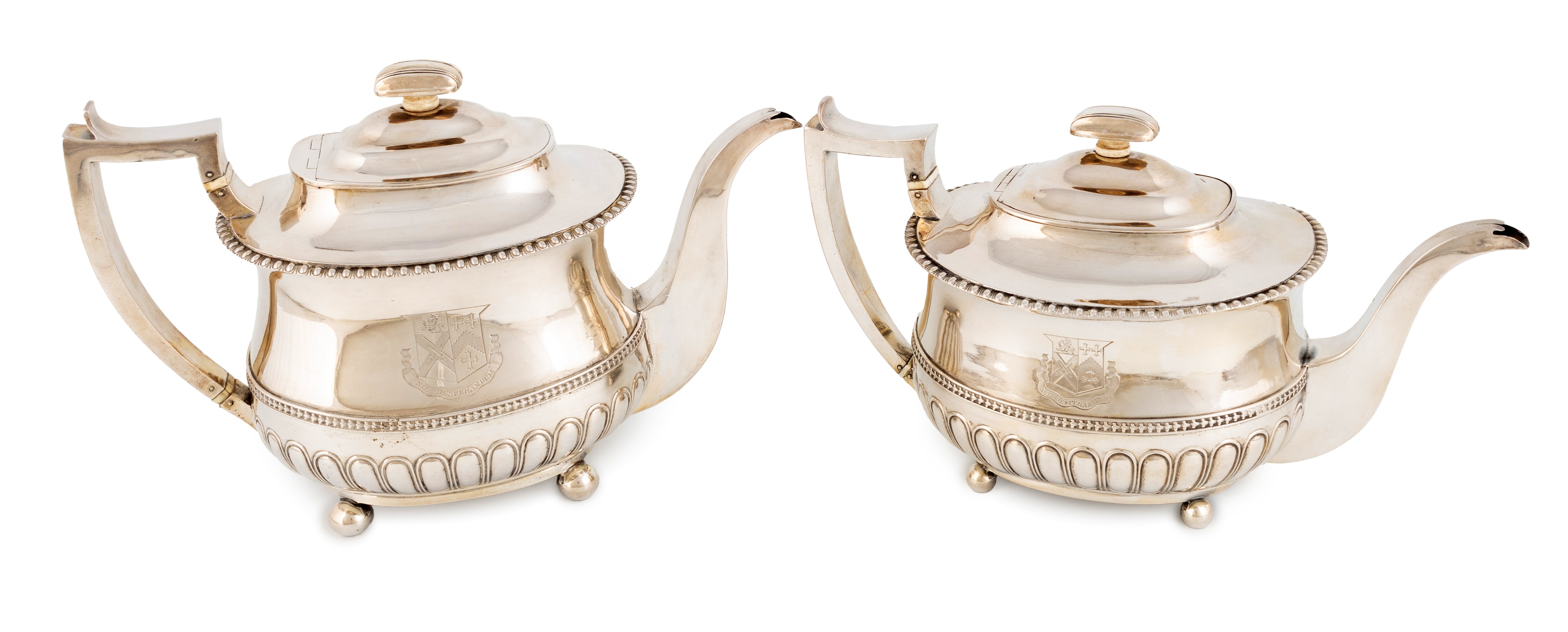 oblong bellied form, part-fluted decoration, the scroll handles with ivory insulators, the hinged covers with rectangular finials with ivory mounts, engraved with an armorial, on four ball feet, length handle to spout 30.5cm and 30cm, approx. weight 57oz. (2).