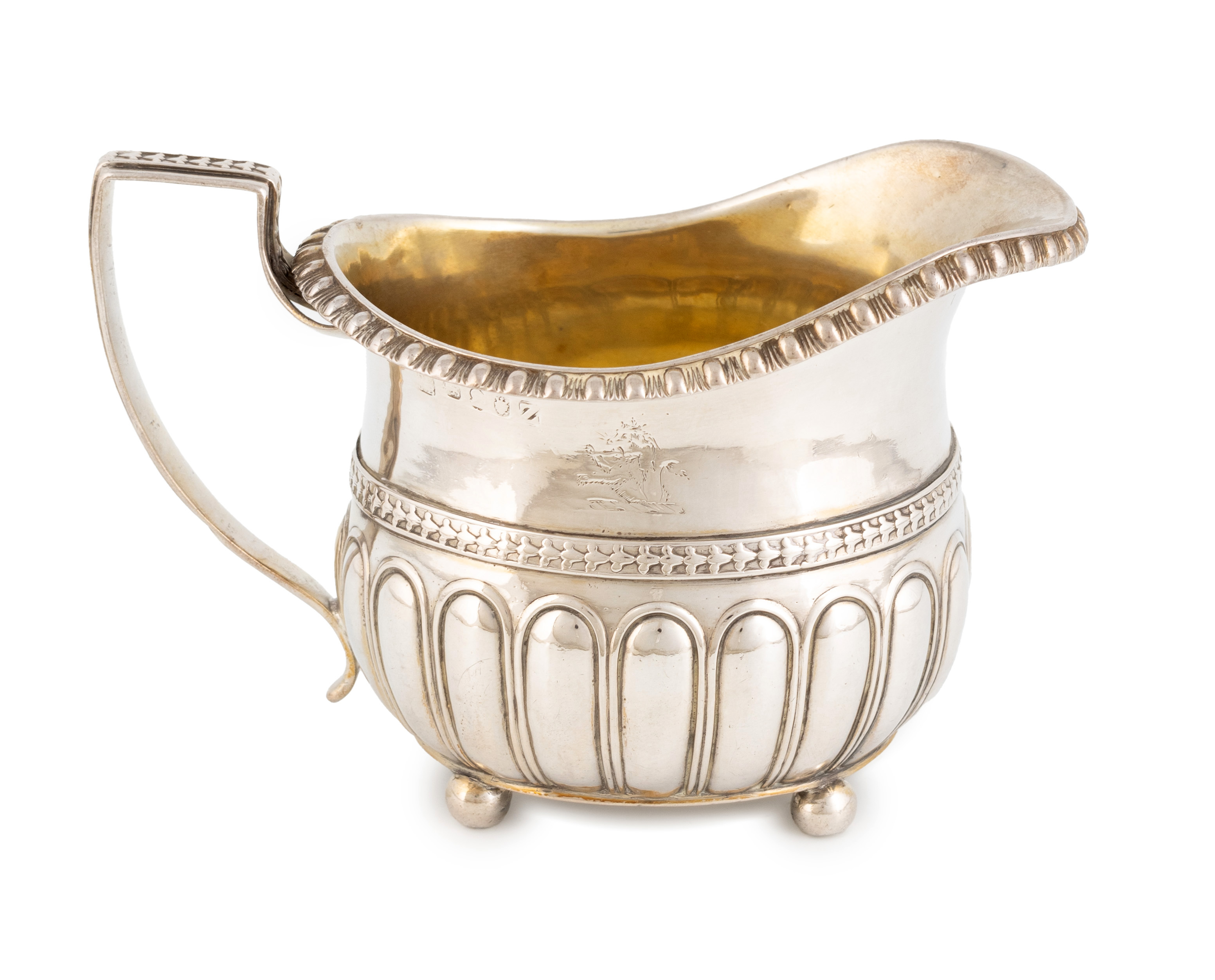 oblong bellied form, part-fluted decoration, scroll handle, engraved with a crest, on four ball feet, height 9.5cm, approx. weight 6oz.