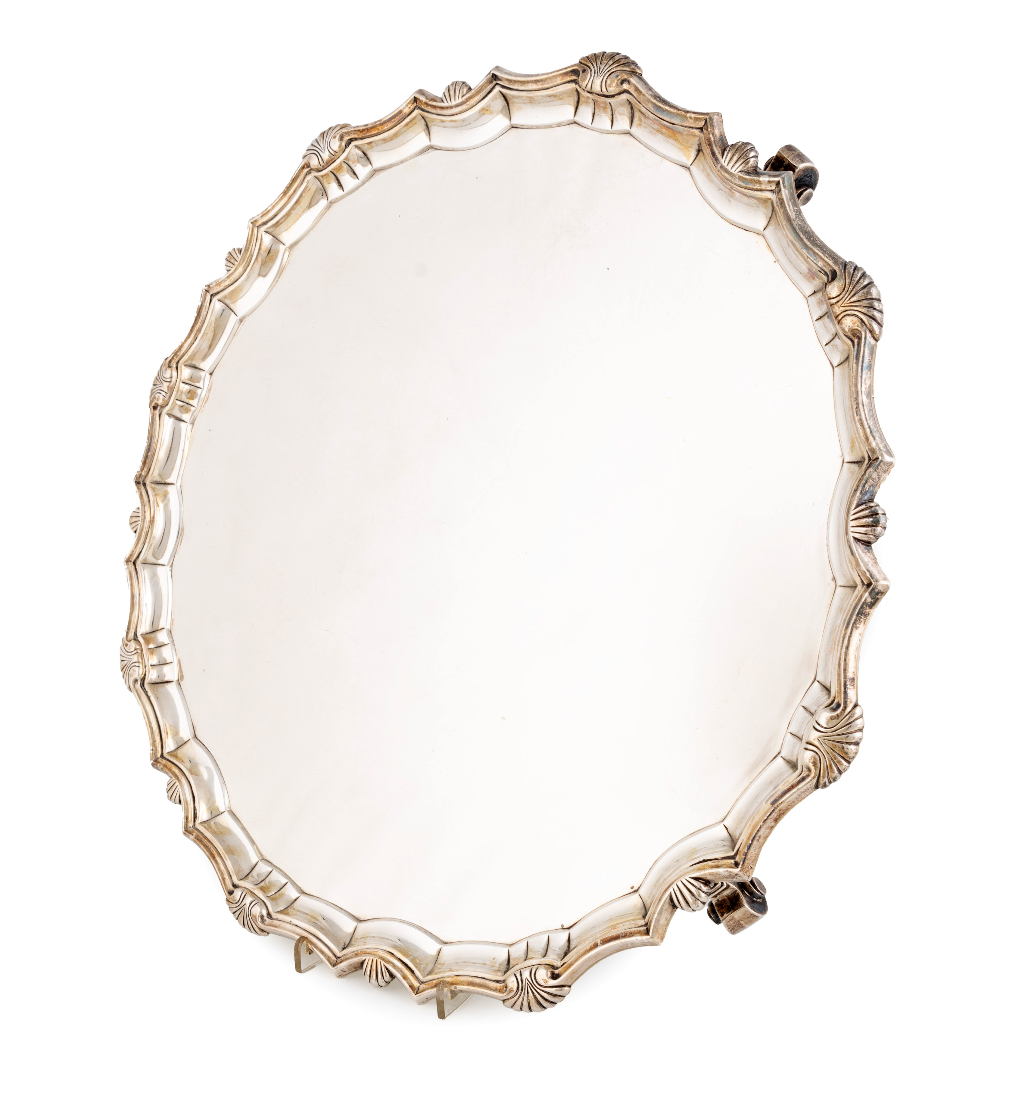 circular form, moulded border, on four scroll feet, diameter 50.8cm, approx. weight 117oz.