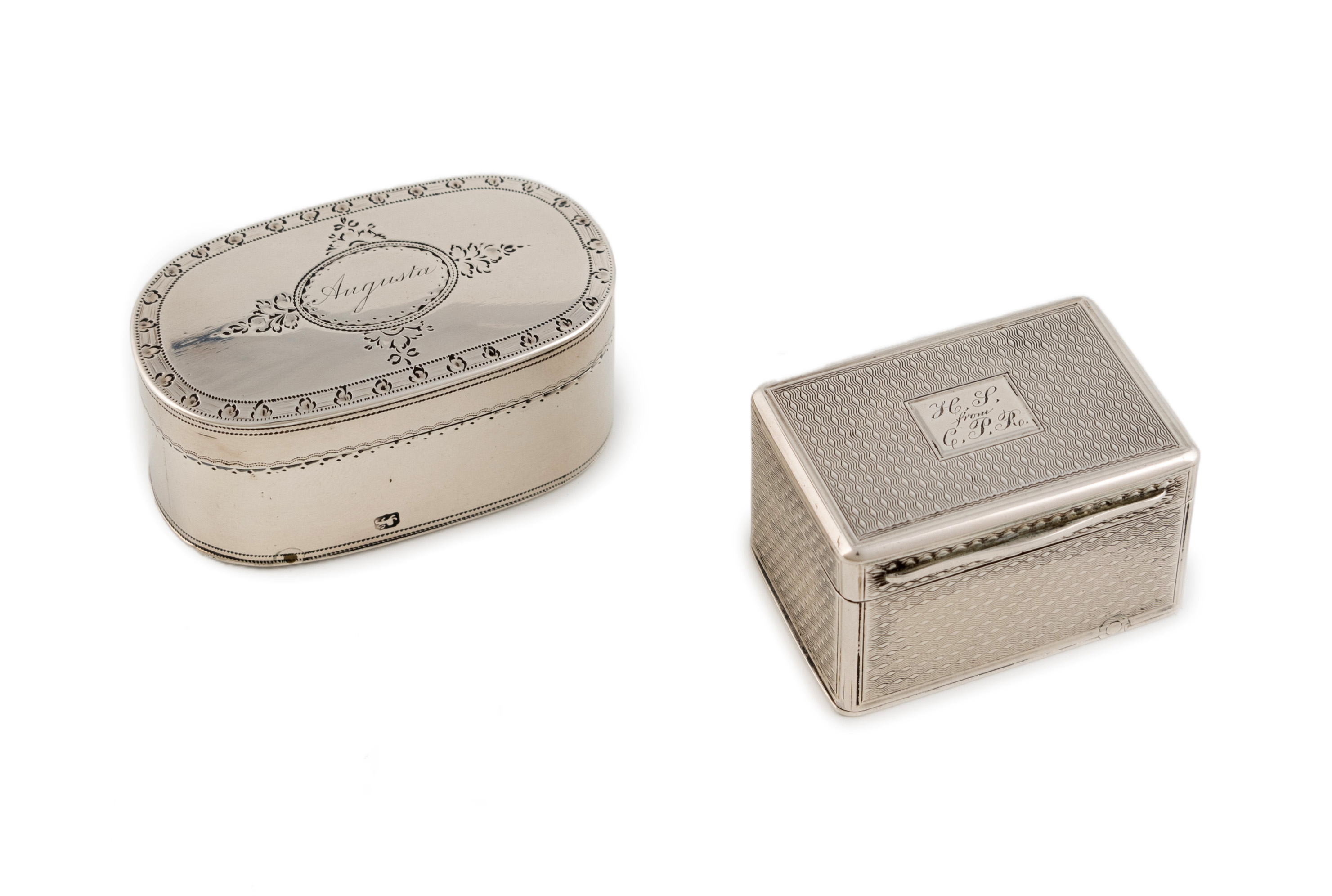 oblong form, engraved borders, hinged cover and base, inscribed 'Augusta', length 4.7cm, plus an early-Victorian silver nutmeg grater, by Rawlings and Summers, London 1837, rectangular form, engine-turned decoration, the cover initialled, length 3.7cm, approx. weight 2.6oz. (2)