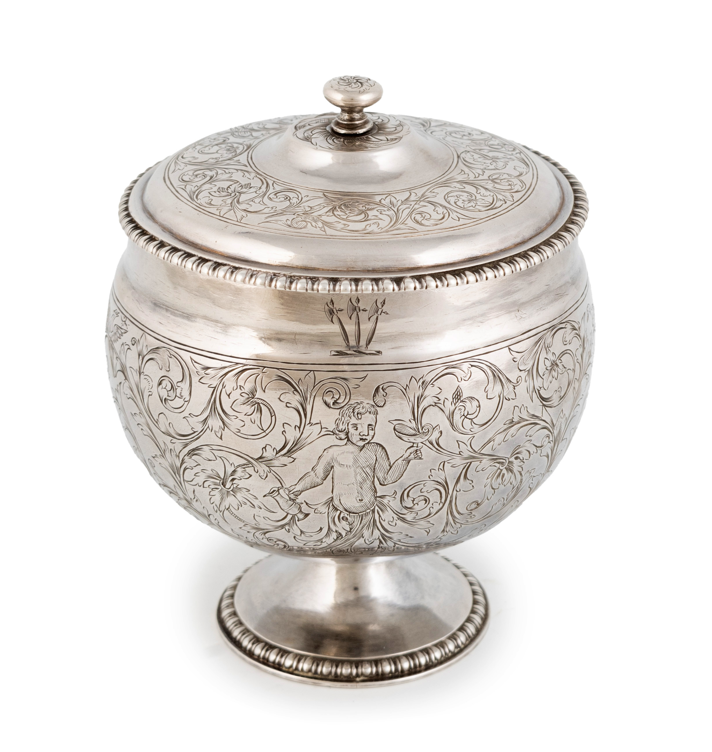 circular form, engraved with figures amongst foliate scroll decoration, gadroon borders, the pull-off cover with similar decoration and with a knop finial, height 12cm, approx. weight 5.9oz.