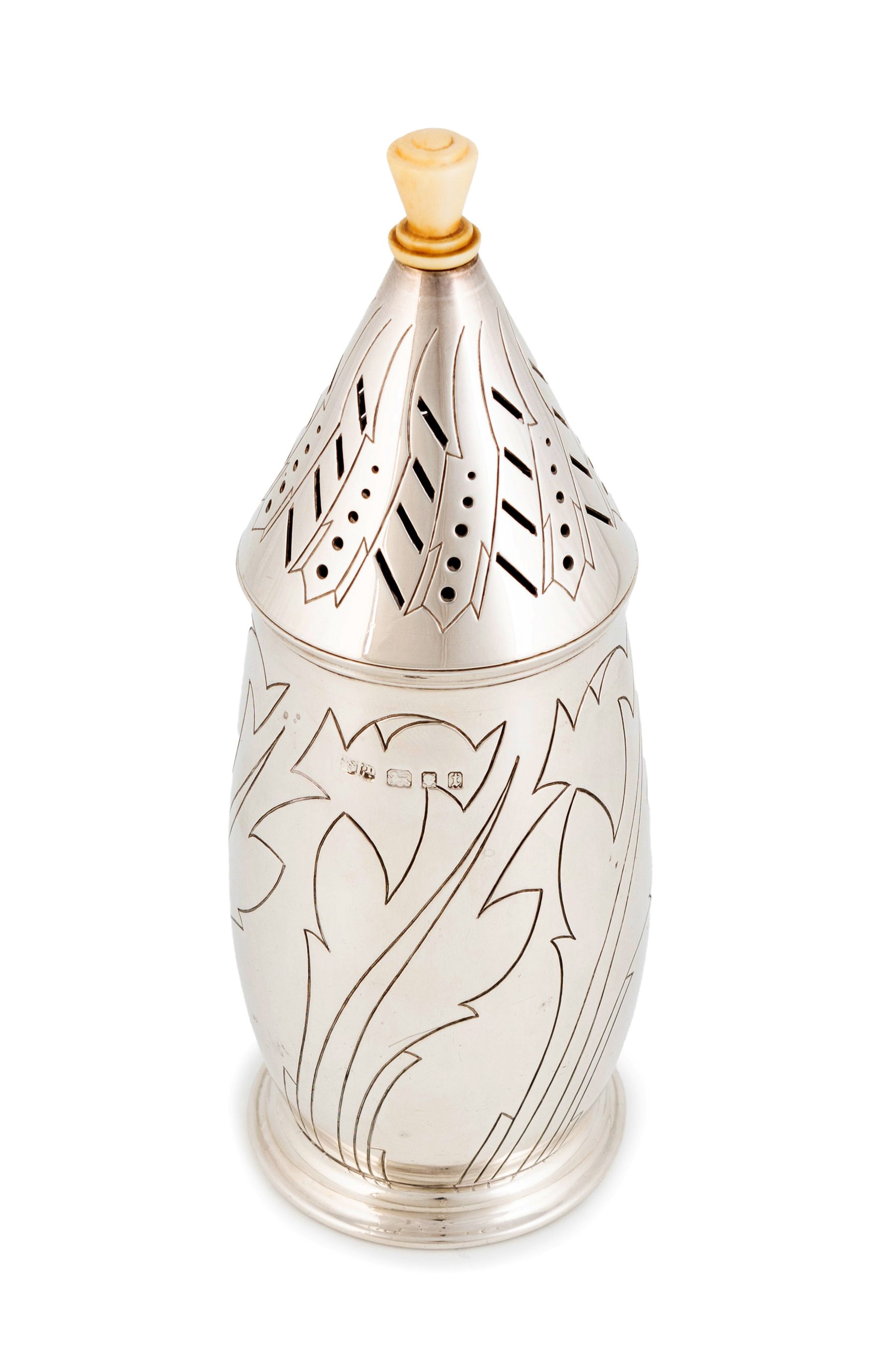 baluster form, engraved foliate decoration, the pull-off pierced conical cover with an ivory finial, on a circular foot, height 18.5cm, approx. weight 7.8oz.