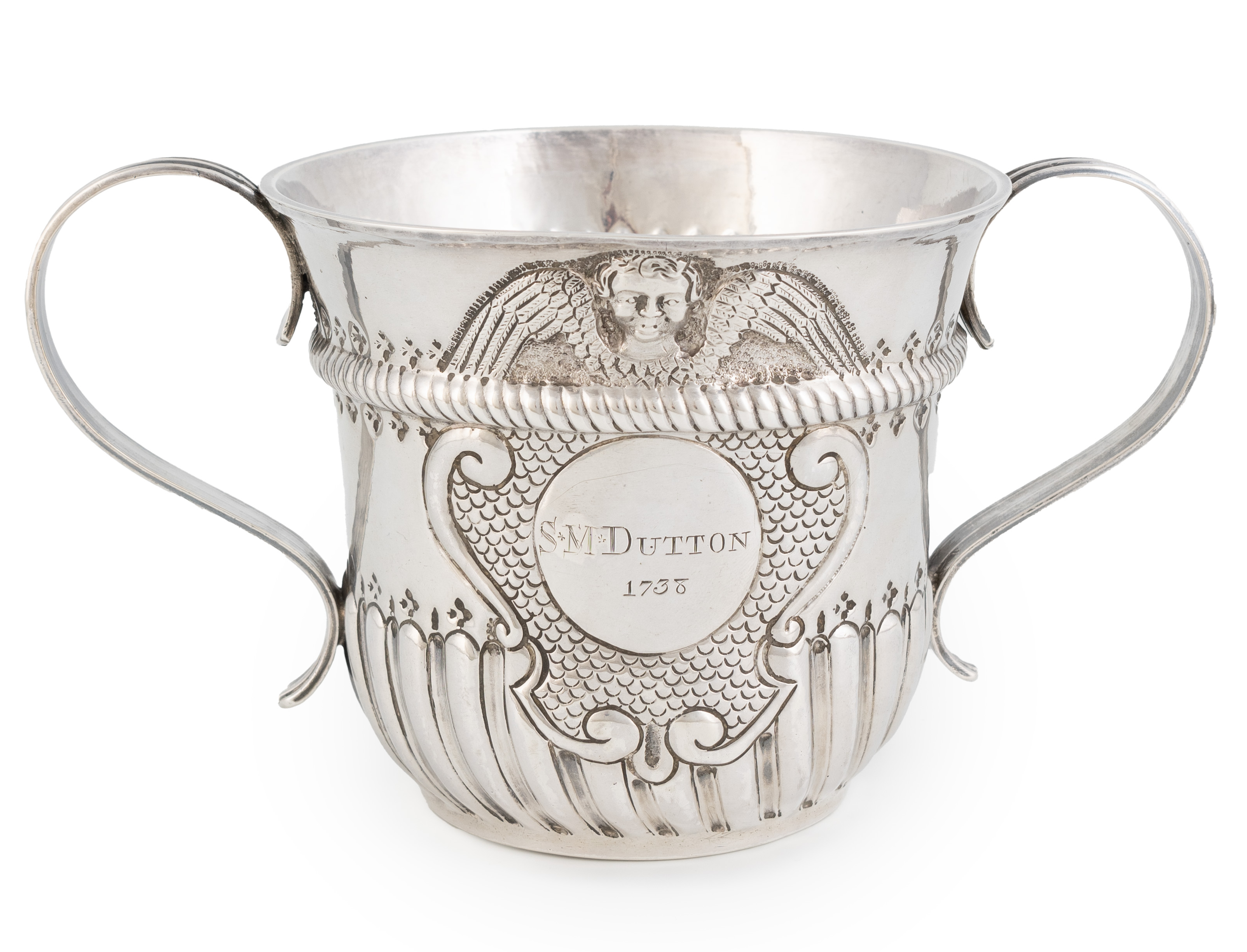circular form, reeded scroll handles, ropework girdle above fluted decoration, with a winged cherub mask, inscribed 'S.M. Dutton 1738', height 11.5cm, approx. weight 12.4oz.