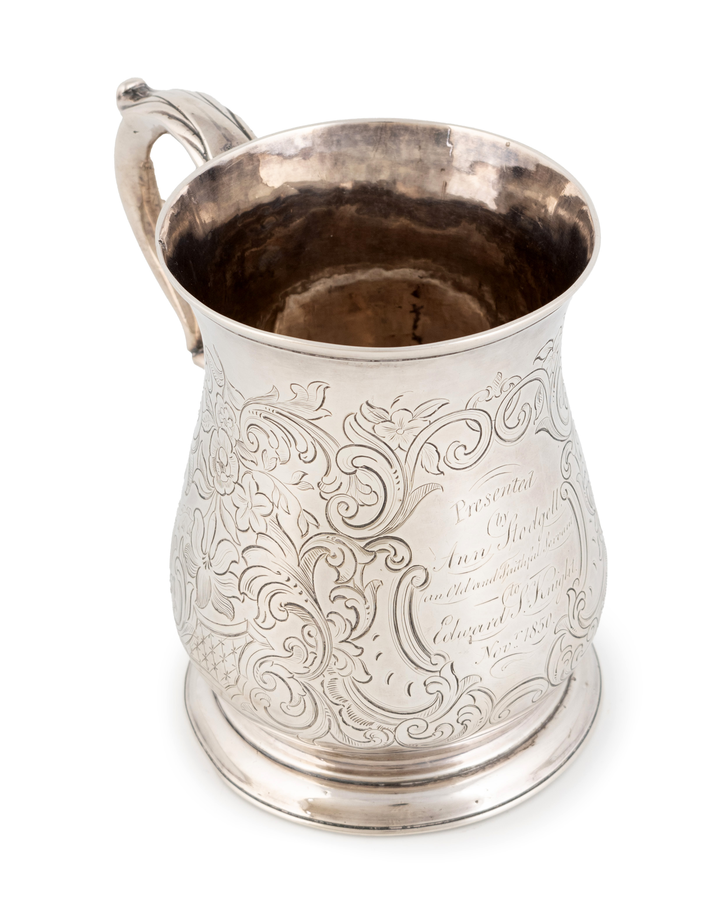 baluster form, leaf-capped scroll handle, later foliate scroll decoration, inscribed 'Presented by Stodgell, an old and faithful servant to Edward Knight, Nov. 1850', on a circular foot, height 11.4cm, approx. weight 8.6oz.