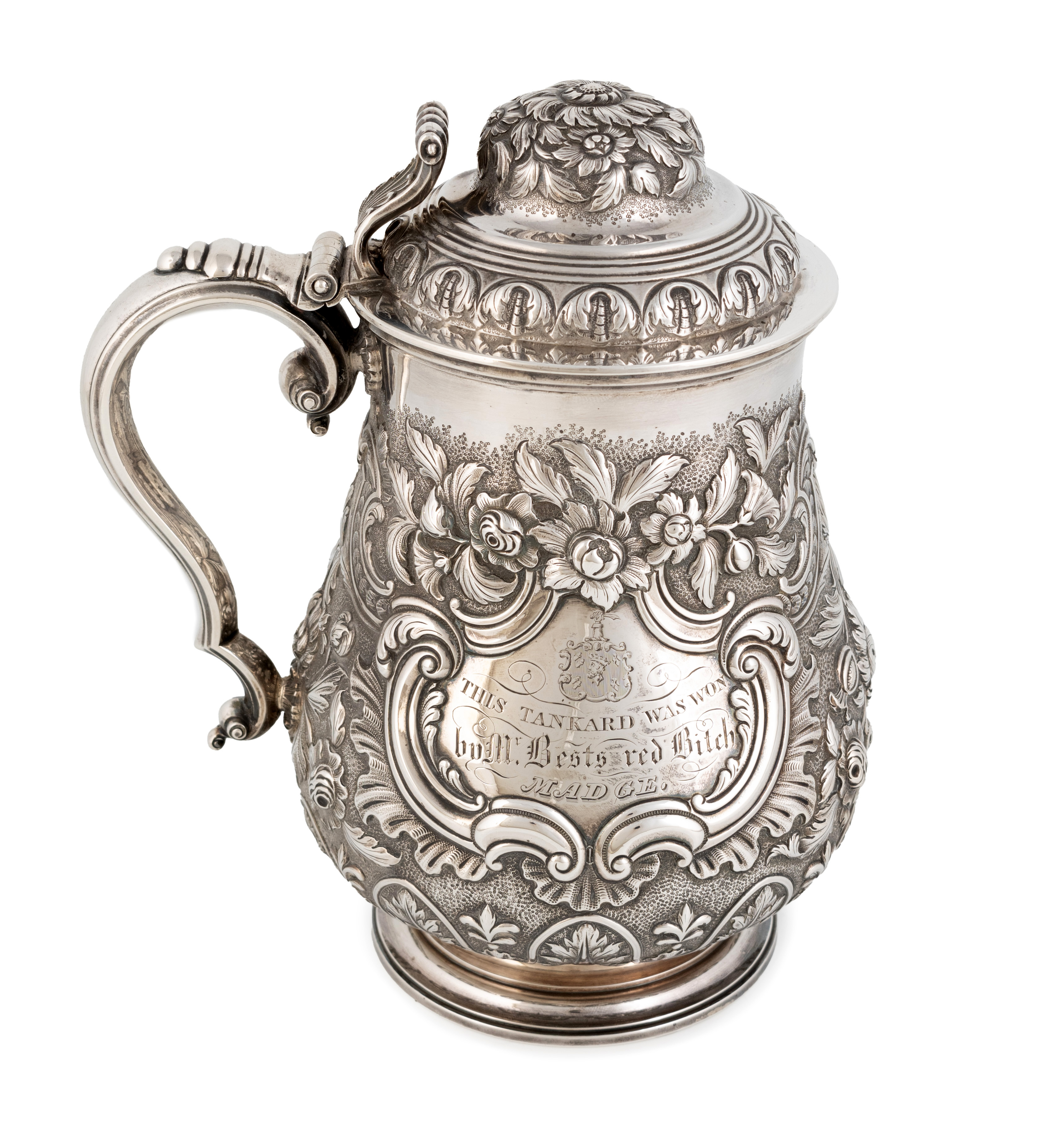 baluster form, embossed foliate scroll decoration, on a matted background, hinged cover, fluted thumbpiece, engraved with an armorial and 'Louth Coursing meeting, October 1826', the reverse inscribed 'This tankard was won by Mr Best's red Bitch Madge', height 23cm, approx. weight 35oz.