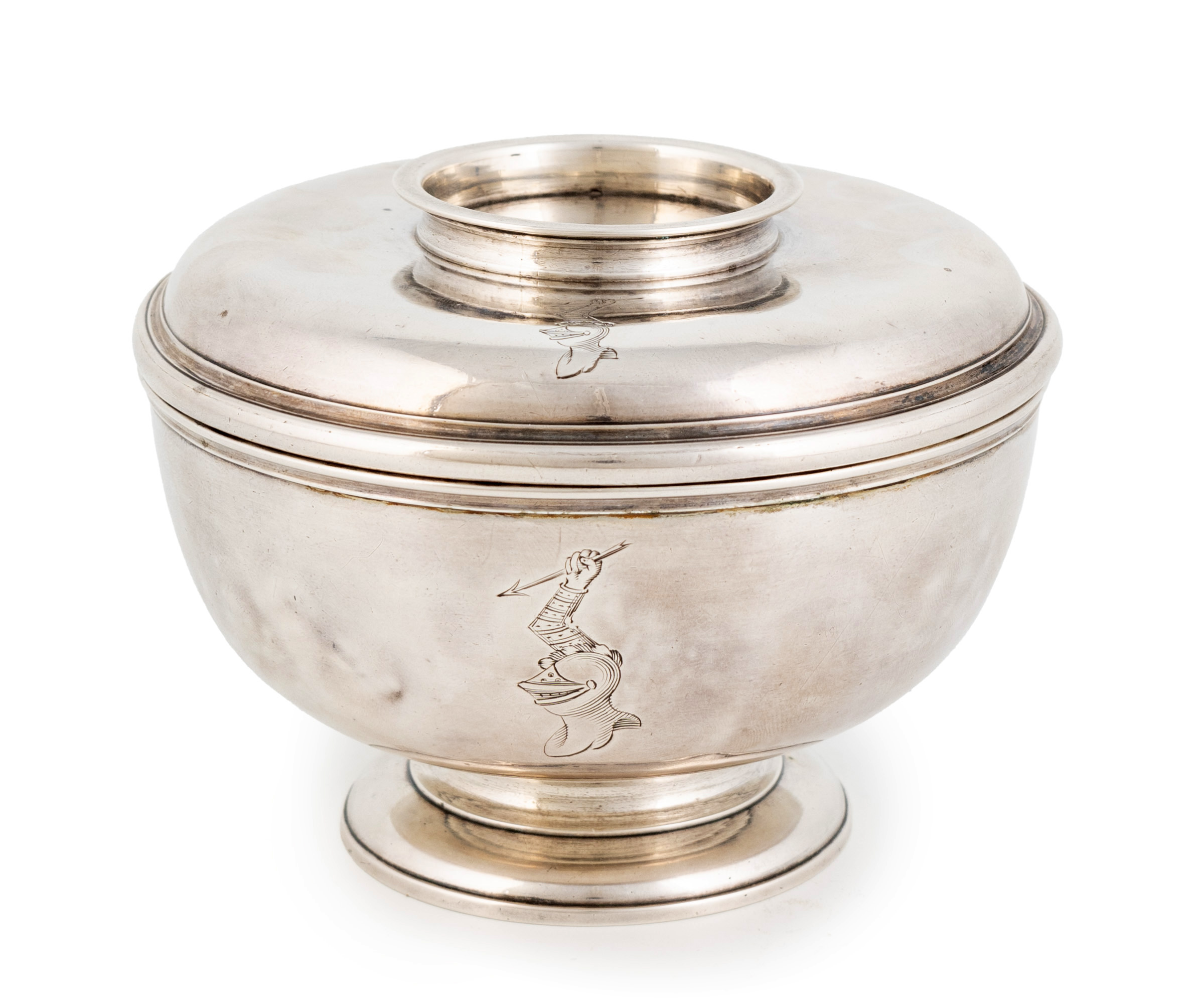 circular form, the pull-off cover and body with a crest, on a circular foot, height 10.5cm, approx. weight 8oz.