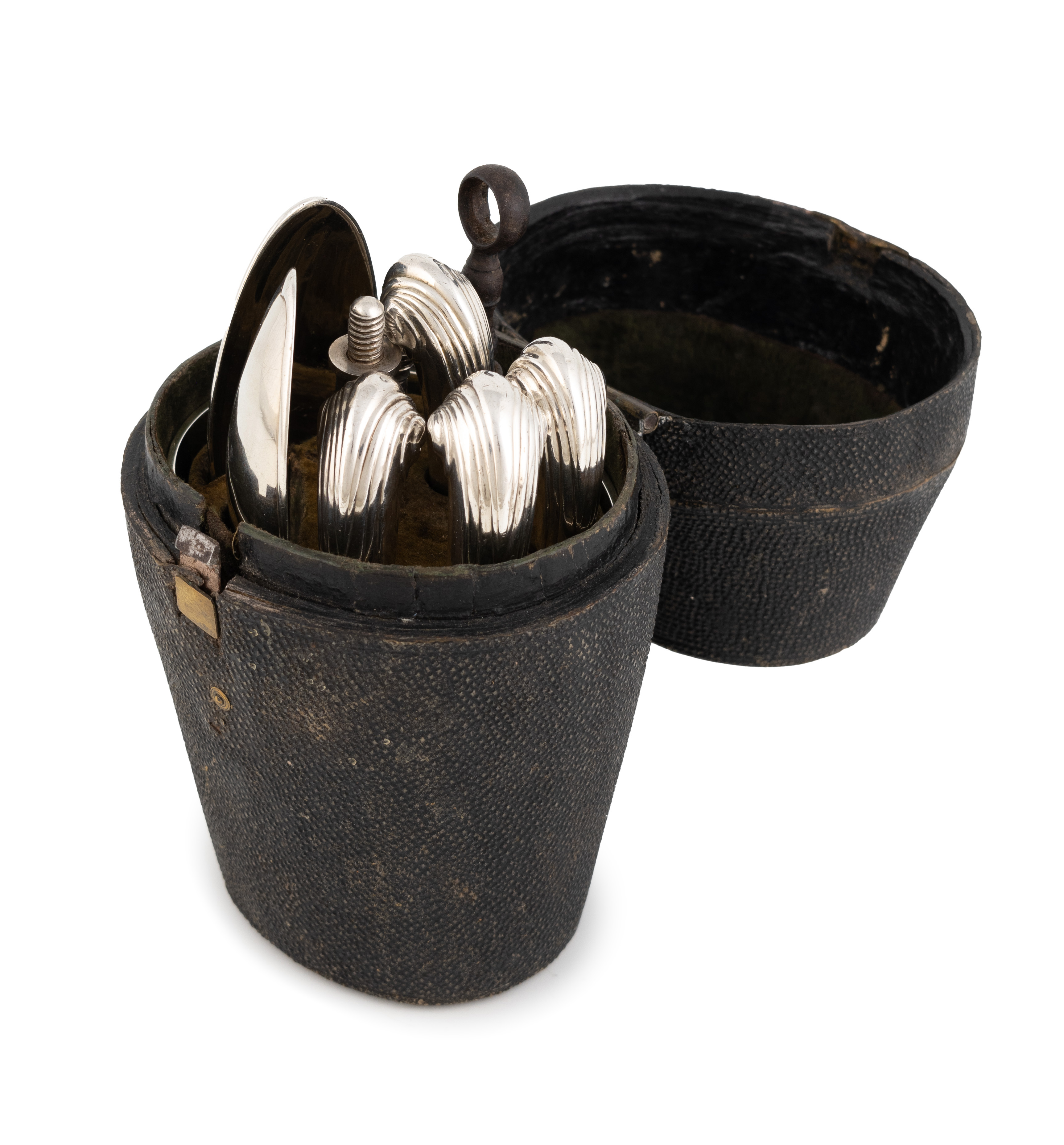 comprising: a beaker of tapering oval form, gilded interior, plus two spoons, a knife and fork, with screw-in pistol-grip handles, engraved with a crest, with a later steel corkscrew, in a fitted shagreen case, height of beaker 8.4cm, height of case 15.7cm, approx. weighable 7.3oz.