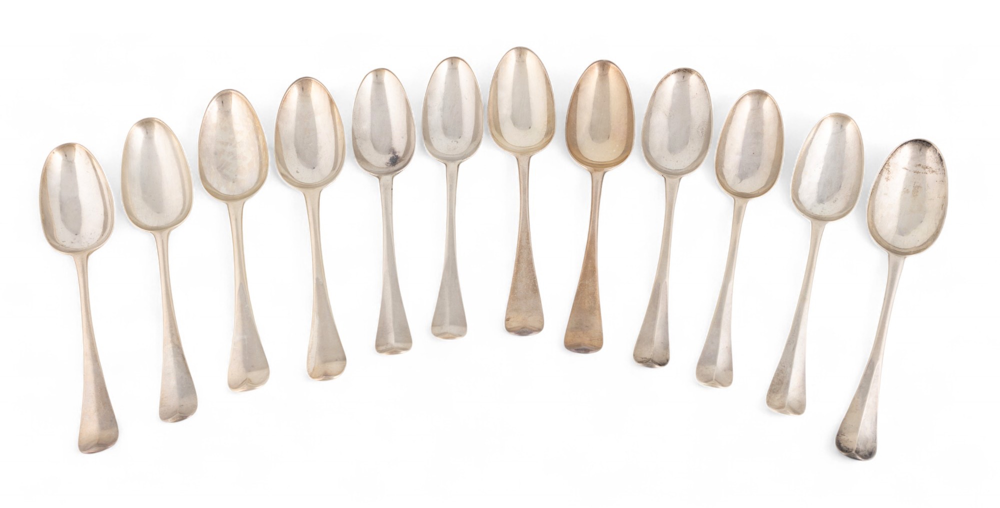 comprising: a pair by Edward Bennett, London 1834, the reverse of the terminals with crests, plus a pair London 1723, a pair London 1747, and three other pairs, with crests or initials, approx. weight 23oz. (12)