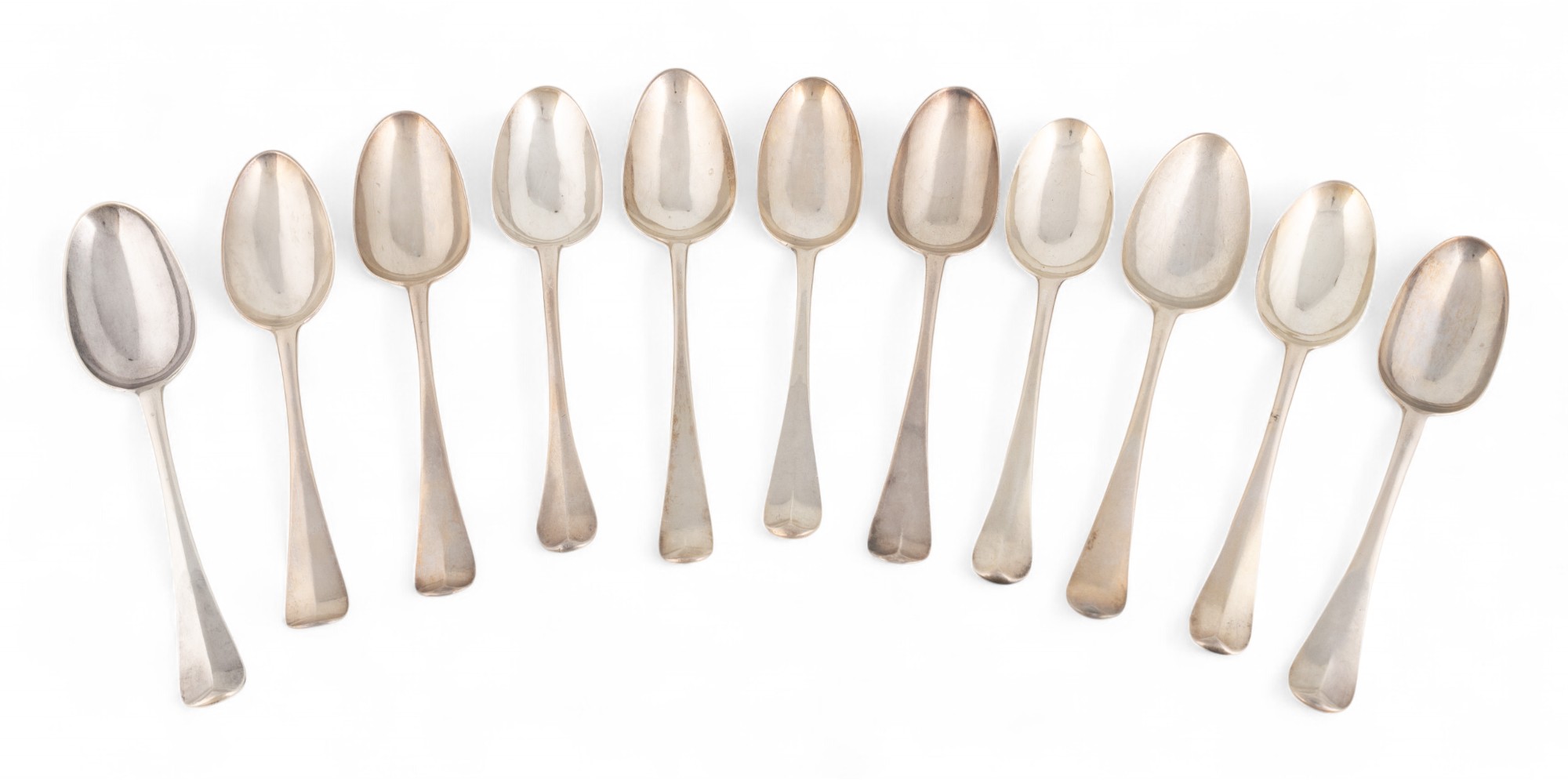A collection of eleven 18th century silver Hanoverian pattern tablespoons,