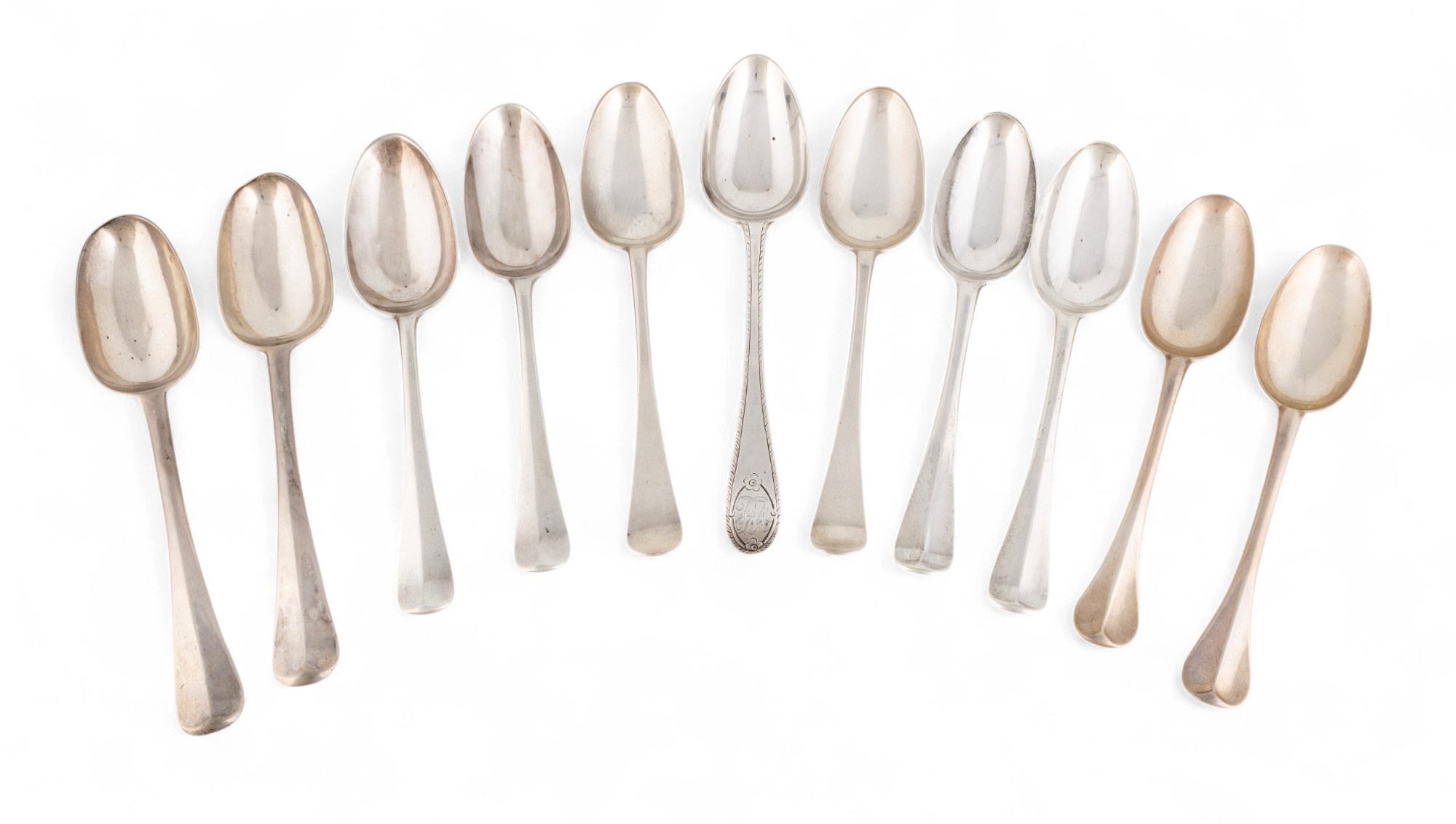 A collection of eleven 18th century Newcastle silver Hanoverian pattern tablespoons,