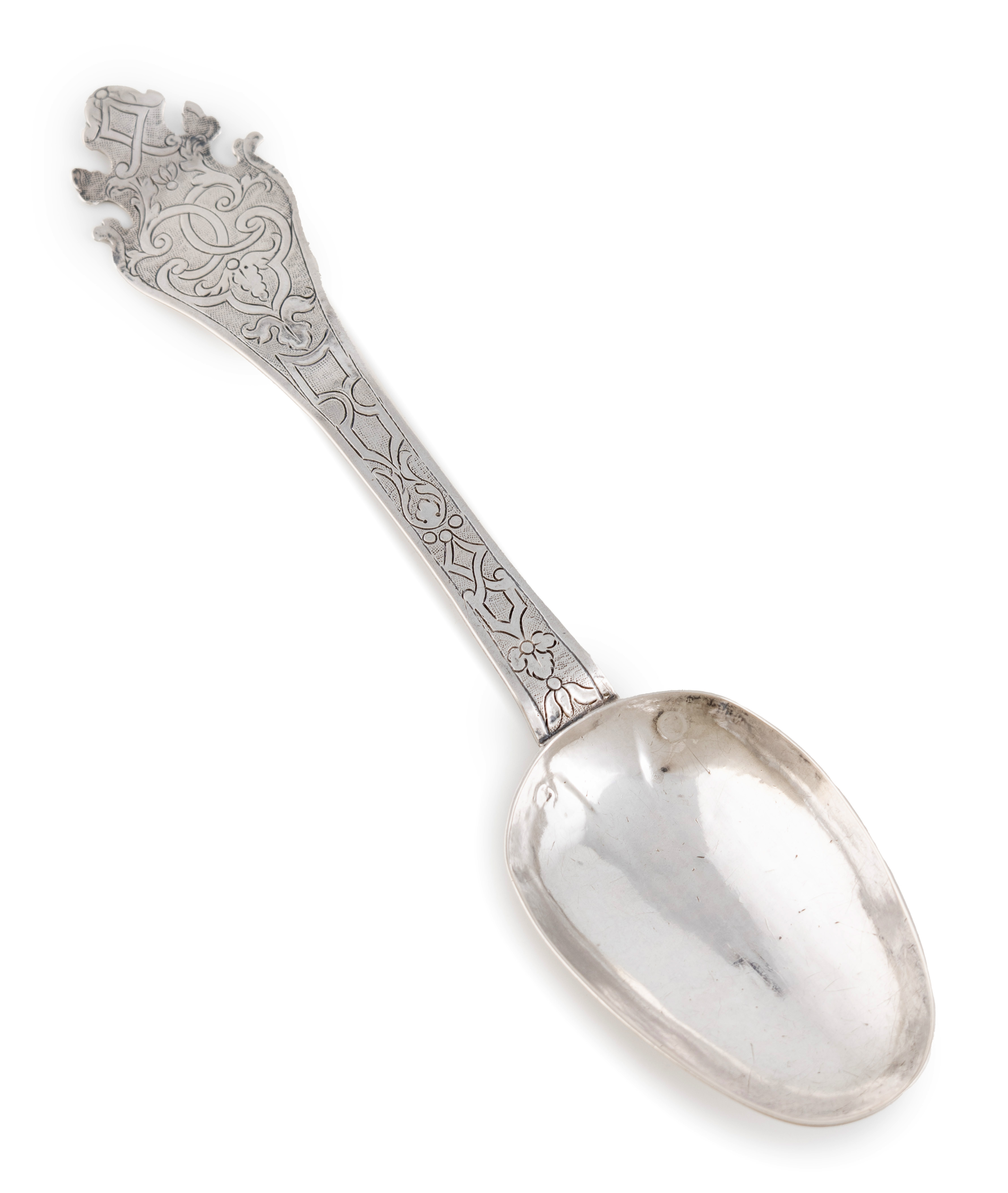 oval bowl with a plain rat-tail, the front and back of the stem with foliate and scroll decoration on a matted background, elaborate Trefid finial, length 20.1cm, approx. weight 1.2oz.