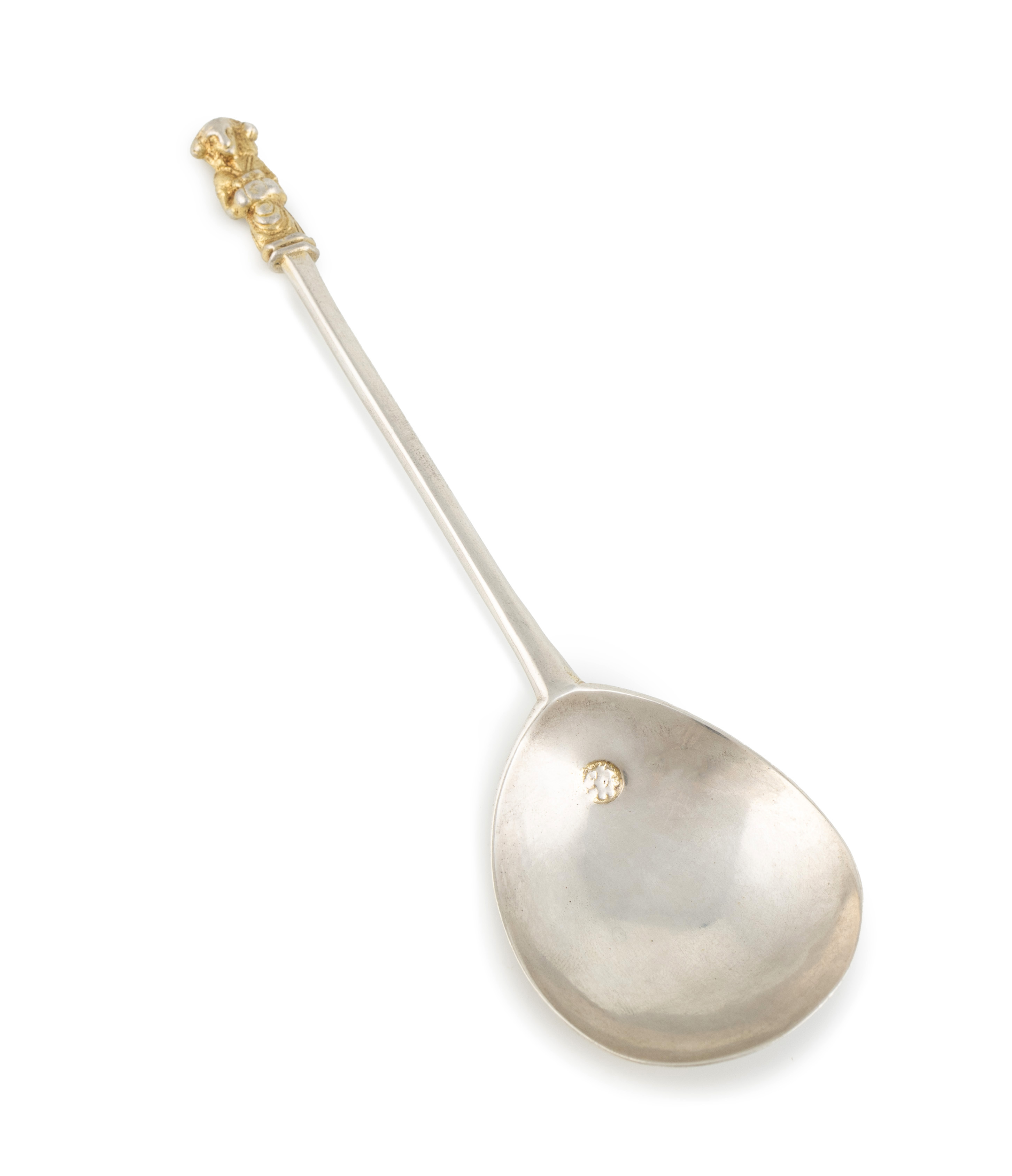 fig-shaped bowl, the reverse of the bowl with prick-dot initials 'MC' over 'W?F', tapering faceted stem with a gilded finial, length 19.2cm, approx. weight 1.7oz.