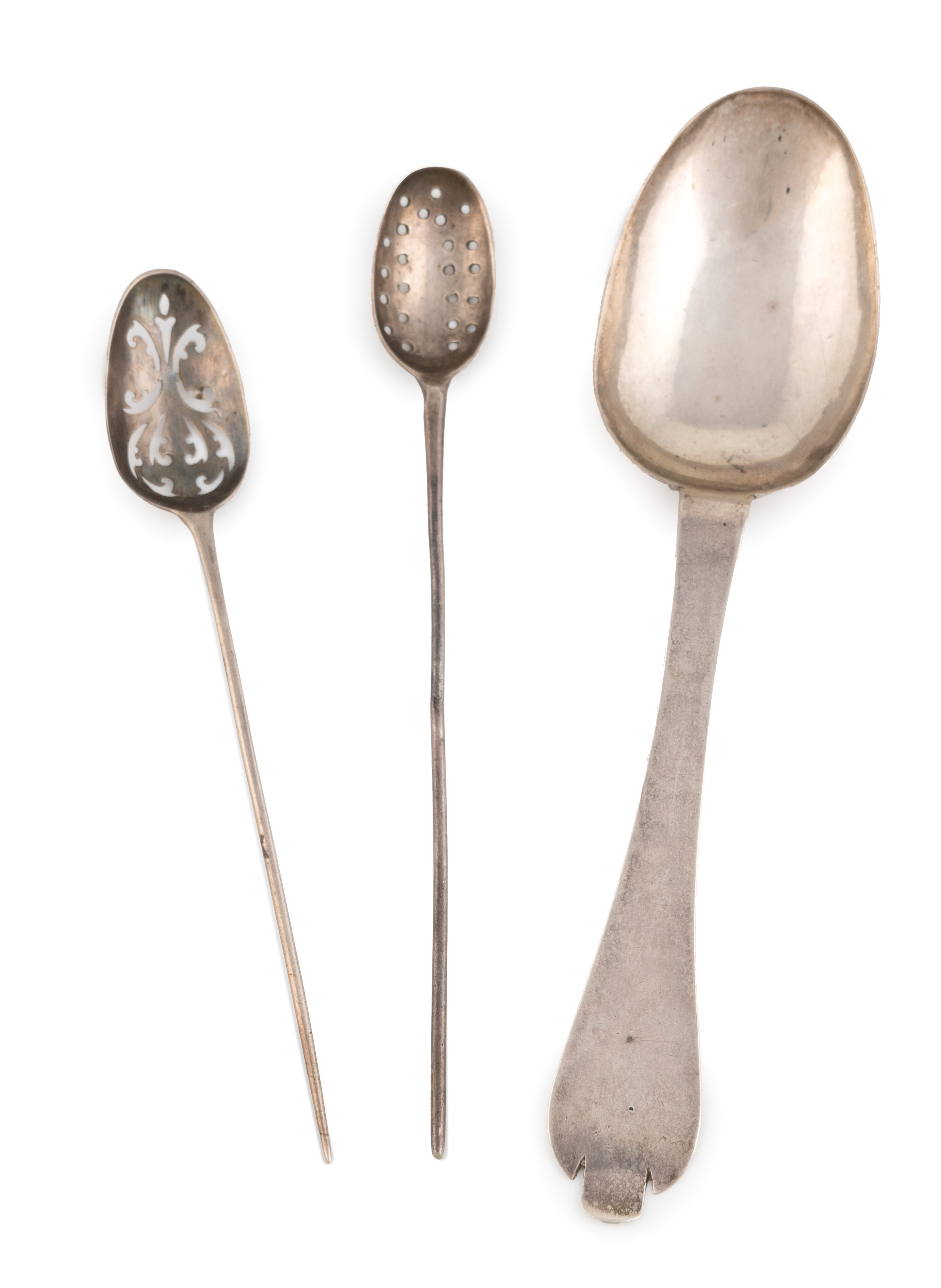 scratched initials to the reverse of the terminal 'I.M.T', length 17.5cm, plus two 18th century mote spoons, total approx. weight 1.3oz. (3)