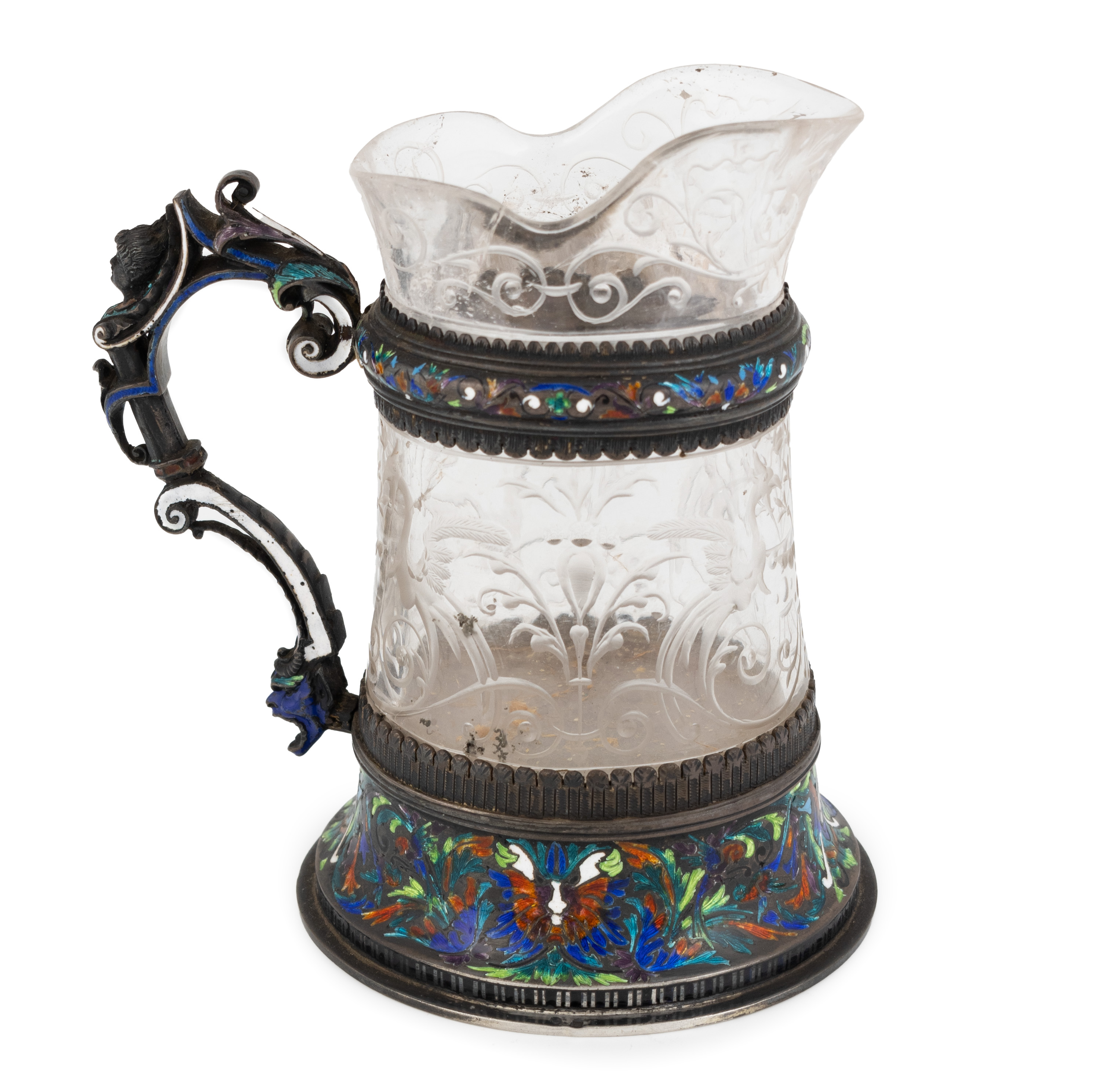 A 19th century Austrian silver and enamel-mounted rock crystal jug,