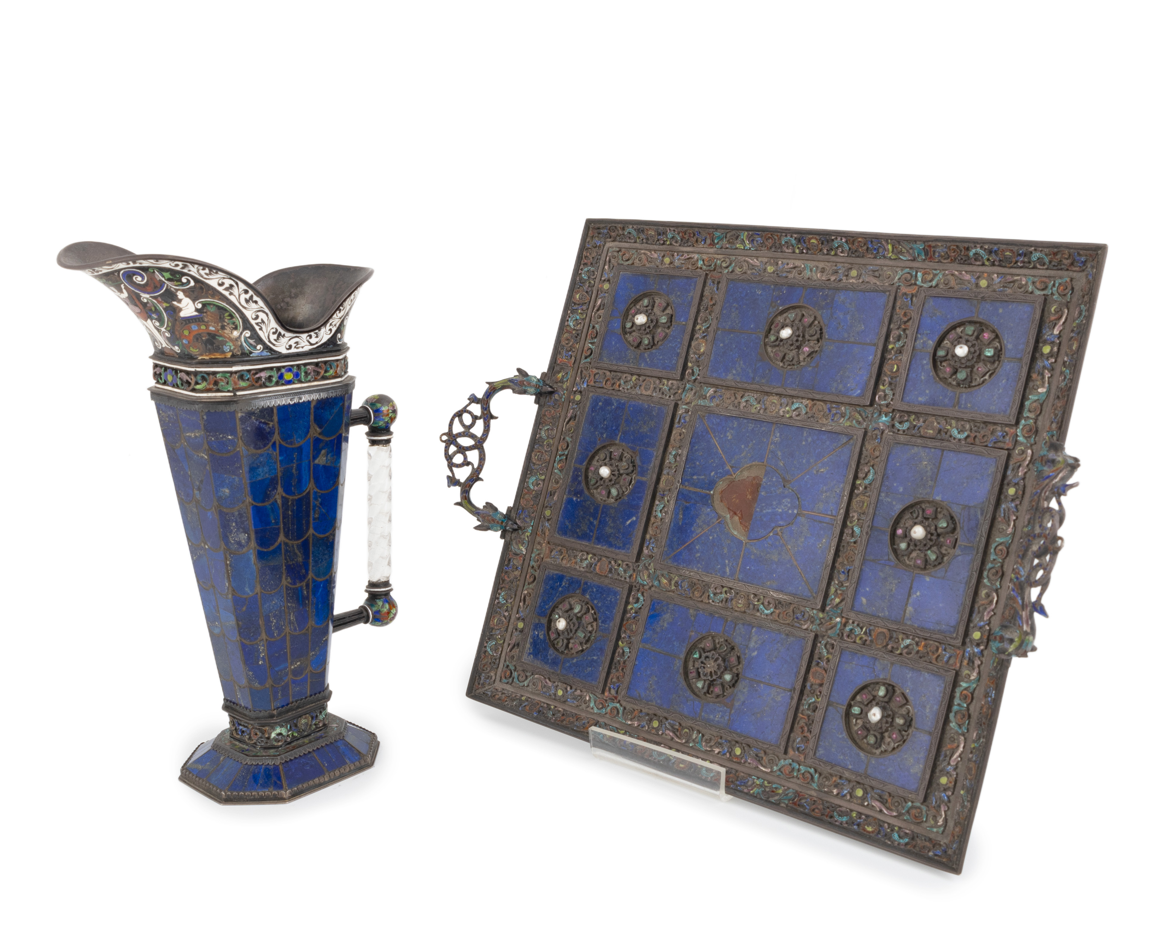 A 19th century Austrian silver and enamel-mounted lapis lazuli ewer and two-handled tray,