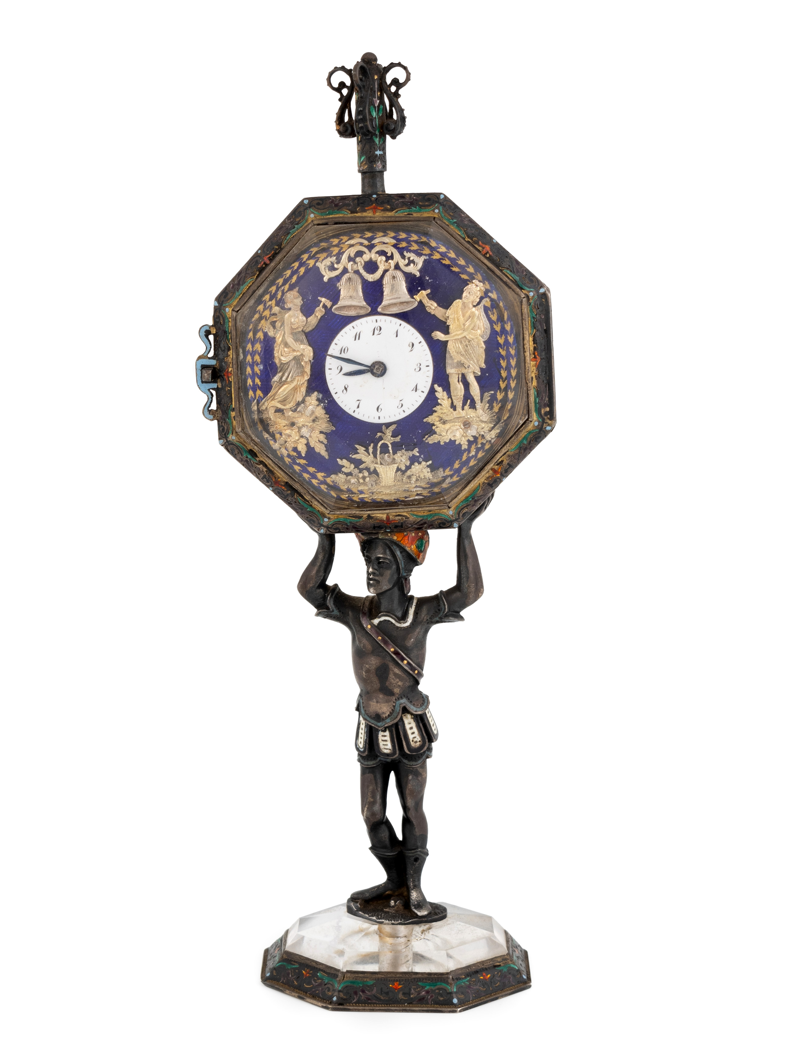 supported by a standing warrior with raised arms, the octagonal-shaped case with enamel scroll decoration, and with a pierced finial, the face with two silver figures and two bells on a dark blue ground, white enamel dial, with a French movement signed 'Breguet a Paris' and 'N 7371', on a shaped rectangular foot, with a key and in a fitted case, height 18.2cm.