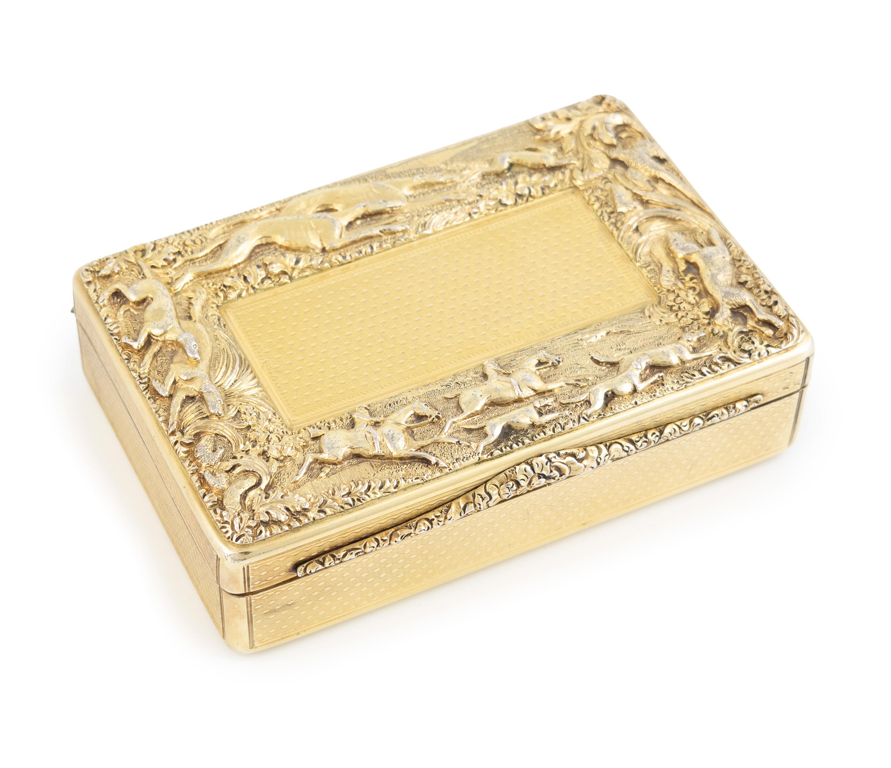 rectangular form, engine-turned sides and base, the hinged cover with a raised cast border of hunting scenes with horses and hounds and coursing, foliate thumbpiece, in a fitted blue velvet-lined leather case, length 8.5cm, approx. weight 4.9oz.