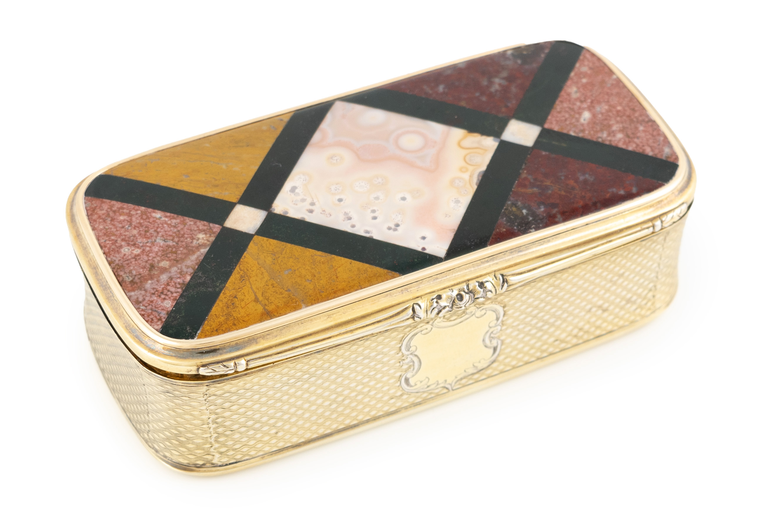 rounded rectangular form, engine-turned sides and base, the front with a vacant cartouche, the hinged cover inlaid with chequered agates, foliate scroll thumbpiece, length 8.9cm, approx. total gross weight 3oz.
