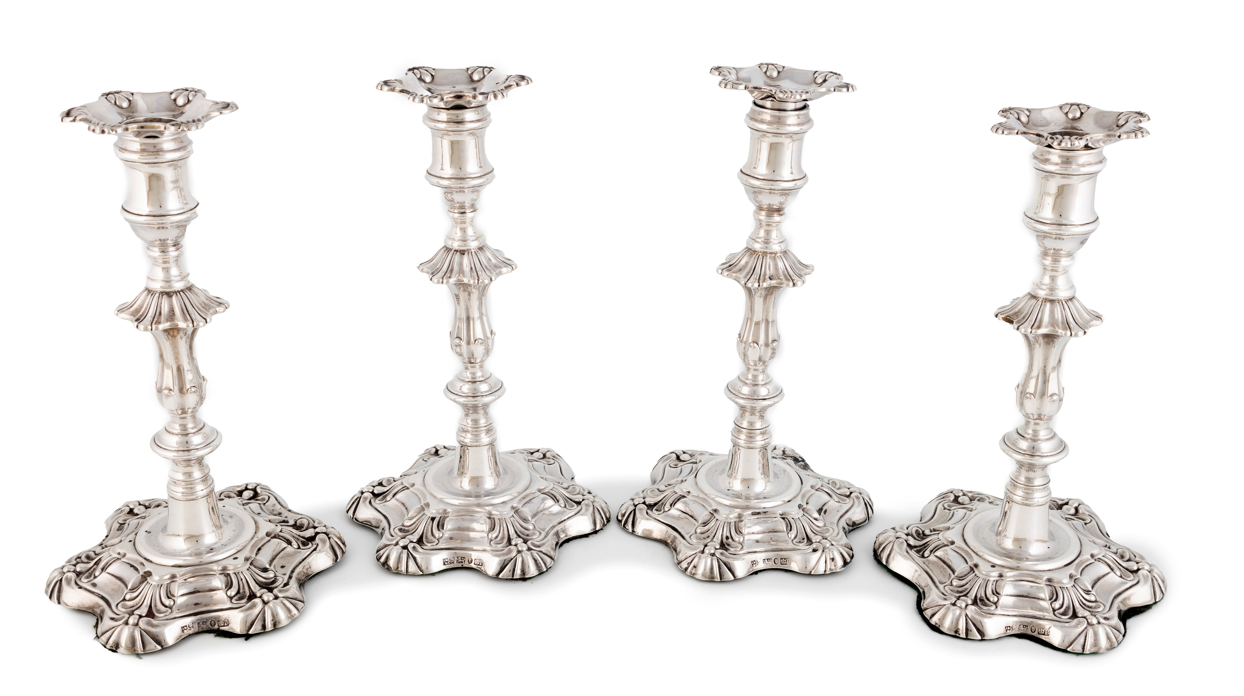 knopped baluster stems, shell shoulders, spool-shaped capitals, detachable drip pans, on hexafoil bases, engraved with a crest, height 23cm. (4)